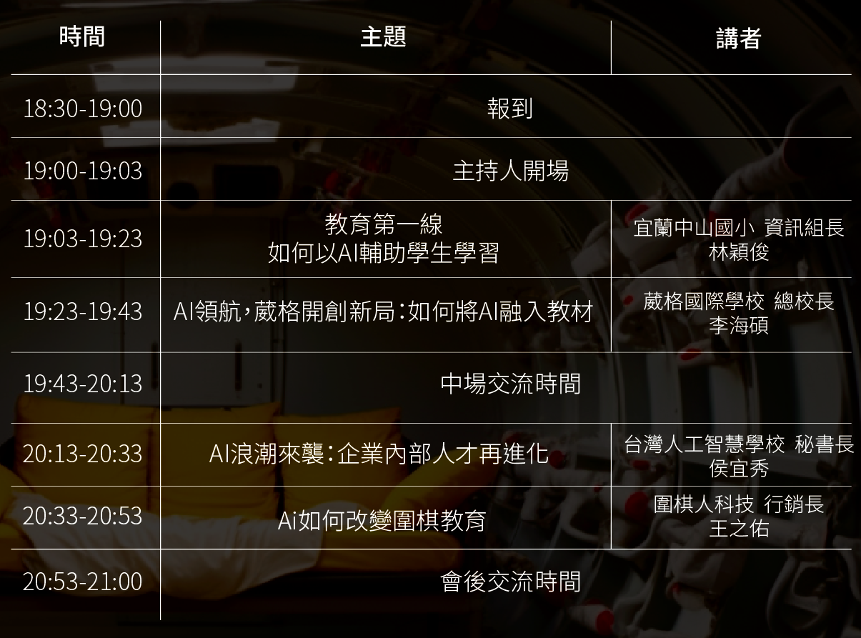 活動時間:19:00 - 21:00(18:30 現場開放報到)