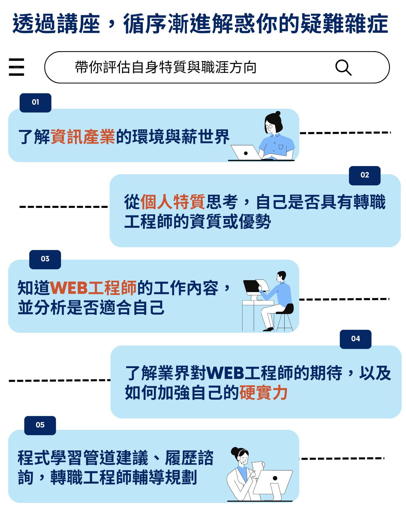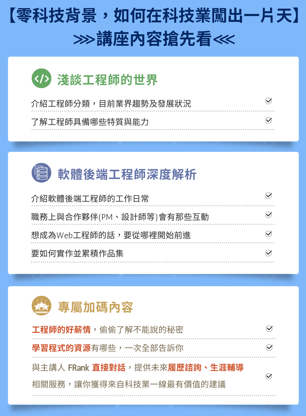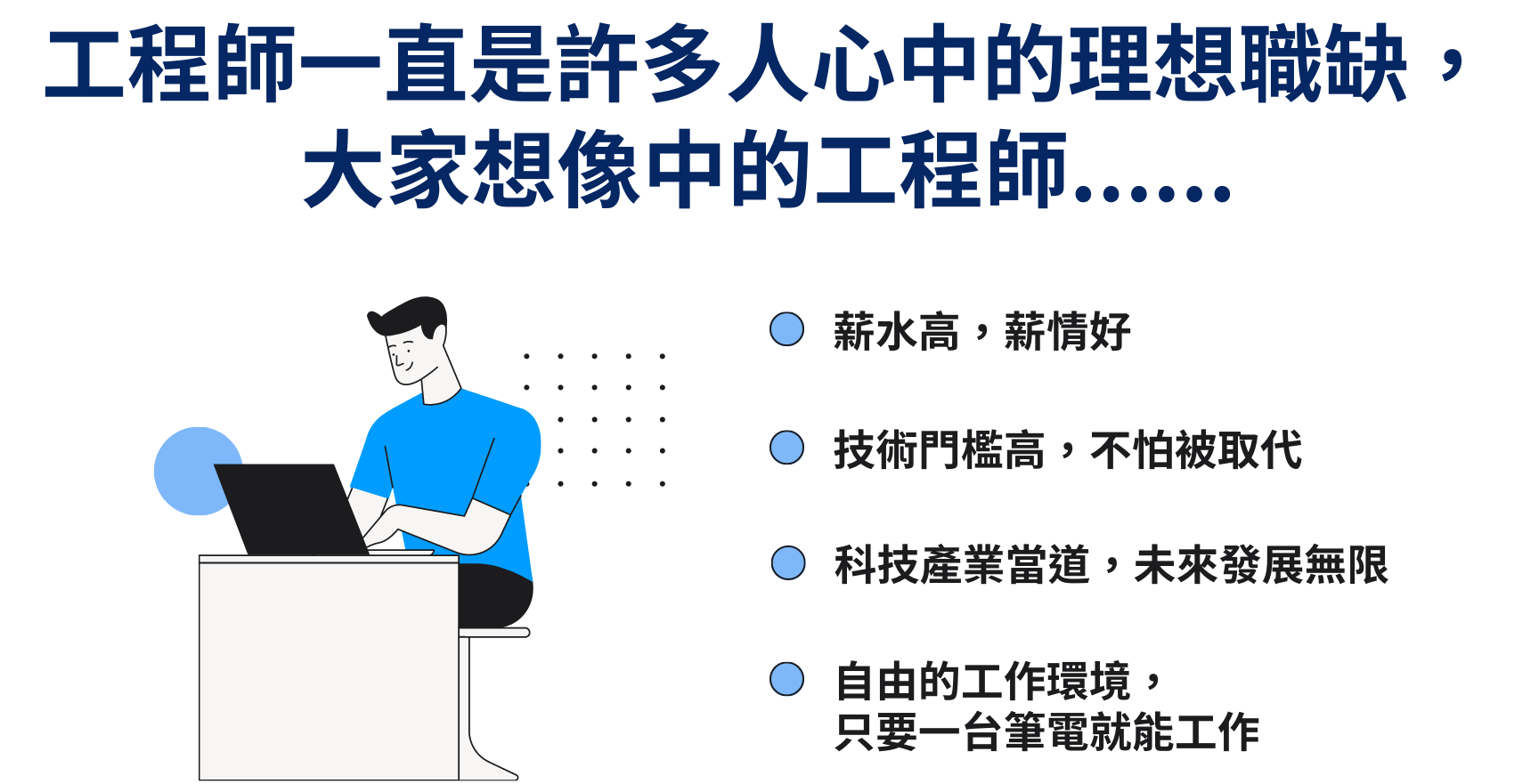 我建議:從了解軟體工程師需要具備哪些能力開始,如何更有效率精進自己的能力,才能在職場中有所輸出? 釐清自己適合什麼樣的職位與報酬。