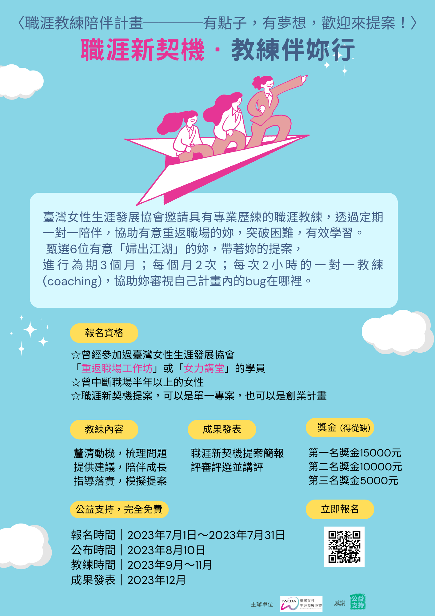 我們誠摯邀請具有專業歷練的職涯教練,為6位有意「婦出江湖」的妳提供為期3個月的一對一陪伴計畫。