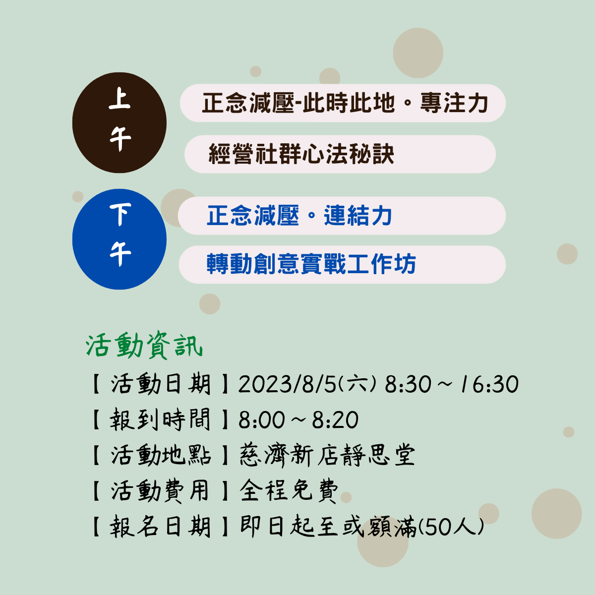在家庭,媽媽快樂全家幸福;在教育現場,有快樂的老師就有幸福的學生,自身擁有安定自在的能量,面對孩子拋的變化球便能游刃有餘的應對;工作坊中穿插靜心、正念飲食、伸展、感恩書寫等正念減壓小技巧,好好照顧自己,自然呈現優質的教學效益。