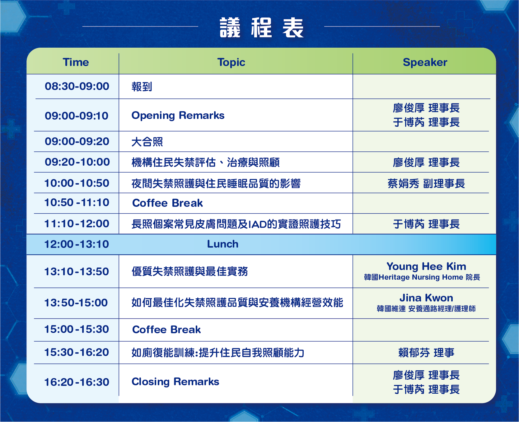 - 論壇名稱:【失禁照護管理與創新論壇】長照機構失禁照護品質: 最佳實踐與經驗分享