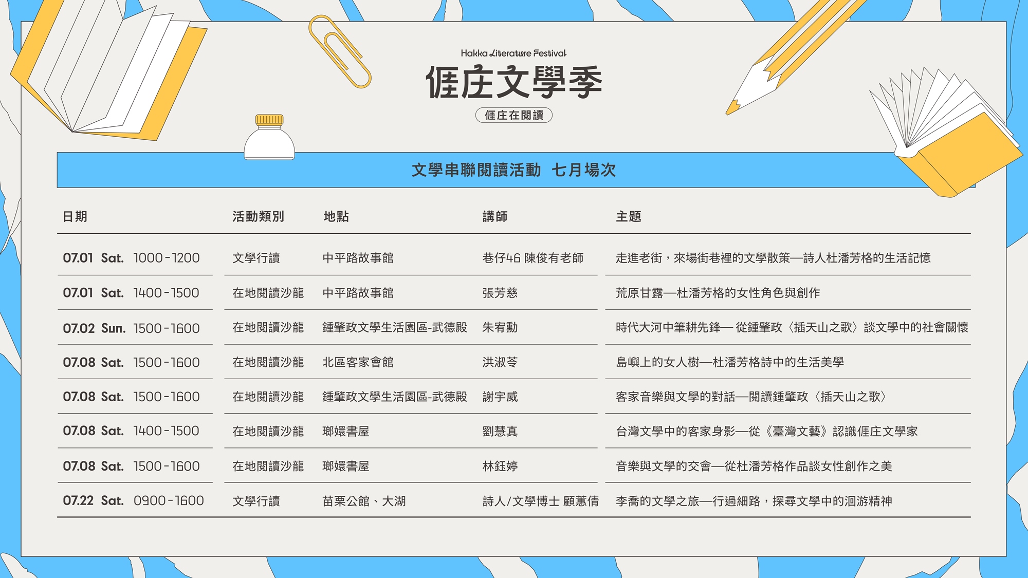 4/15-7/15 期間,將舉辦一系列文學串聯閱讀活動,包含文學行讀、在地閱讀沙龍與文學巡迴展,7月場邀請 巷仔46 陳俊有老師、 詩人 張芳慈、小說家/文學評論家 朱宥勳、客家音樂人 謝宇威、臺灣大學中文系教授 洪淑苓、詩人/策展人 劉慧真、山狗大後生樂團團長/主唱 林鈺婷、詩人/文學博士 顧蕙倩 一起品味客家文學的魅力!