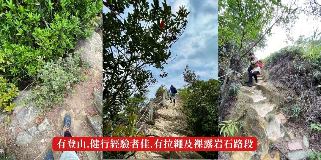 路線含石頭階梯、裸露岩石攀登、山林步道,請穿著舒適適合長時間行走的深痕運動鞋、登山鞋。
