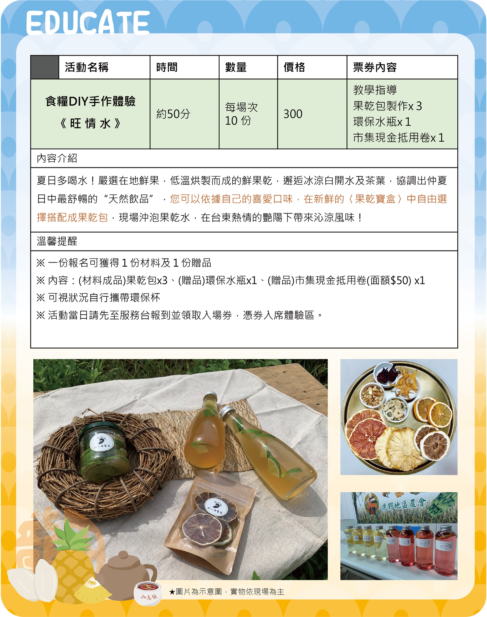 台東縱谷除了盛產稻米,還有繽紛多元的水果,秉持著「愛物惜物」的精神,將微瑕的鮮果製成果乾,精選至少6種夏日果乾,可自由搭配好茶、花草,調配專屬自己的旺情水,繽紛多彩漂浮在瓶中的果乾,像極了鹿野天空的熱氣球,且來自水果的自然甘甜,連害怕甜膩的好漢們都喜歡,炎炎夏日,一口清涼入喉,阿~令人難以忘情的好滋味,我在台東天氣晴。