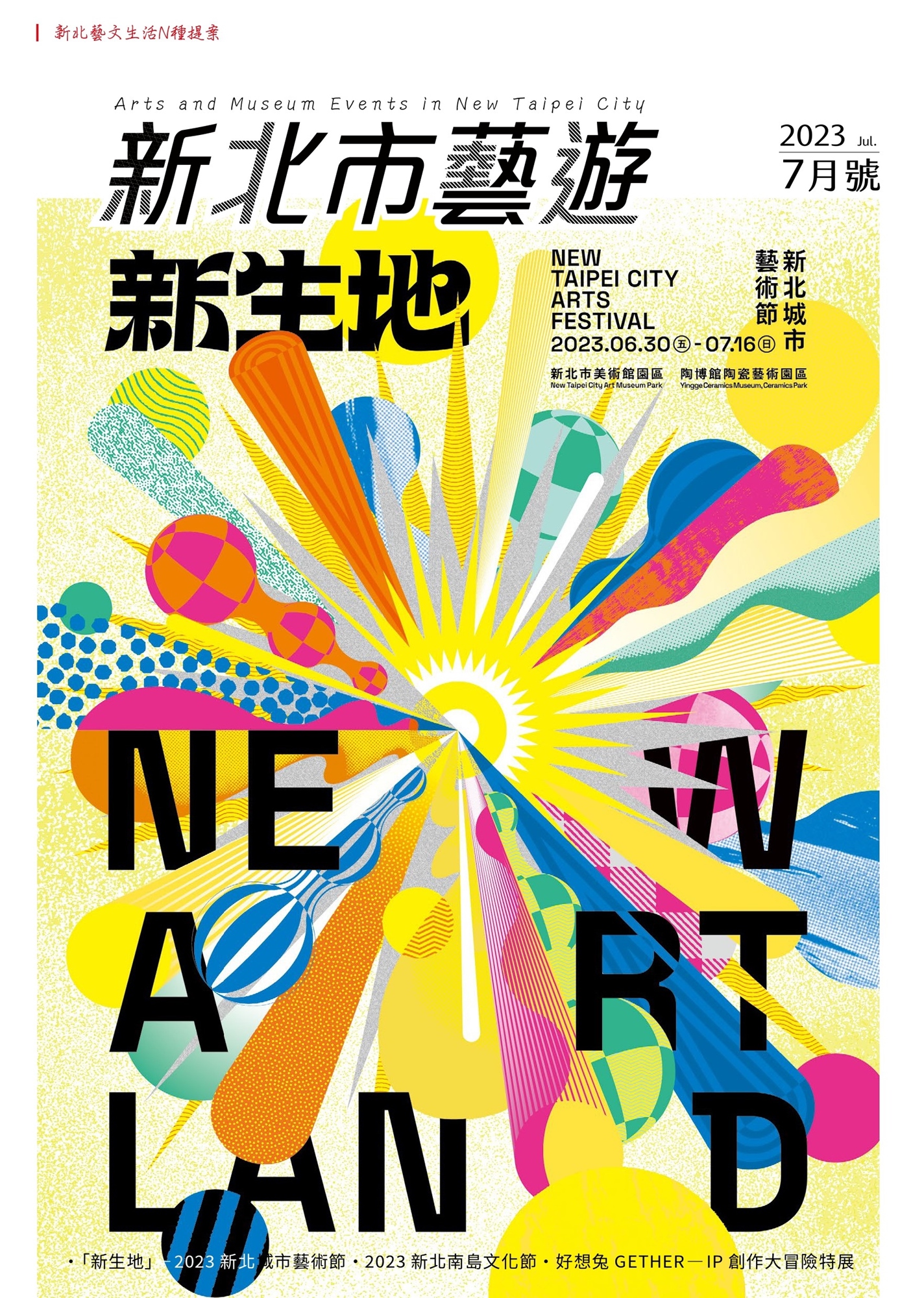 《2023新北城市藝術節》串聯新北市美術館及陶博館陶瓷兩大園區,於6月30日至7月17日展開為期17天的藝術慶典,集結超過40組的國內外藝術家及表演團隊,精采內容包含由朱宗慶打擊樂團領軍的跨界開幕秀演出、13件共創式視覺藝術作品、92場多元型態表演活動,及35場特設活動。