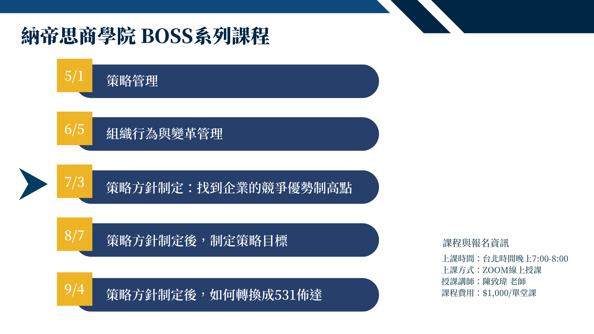 現在就報名加入我們的線上課程,一同學習策略制定的最佳實踐。讓學習成為推動您企業在競爭激烈市場中保持領先地位的關鍵所在,加入我們,開啟您企業持續發展的成功之路!