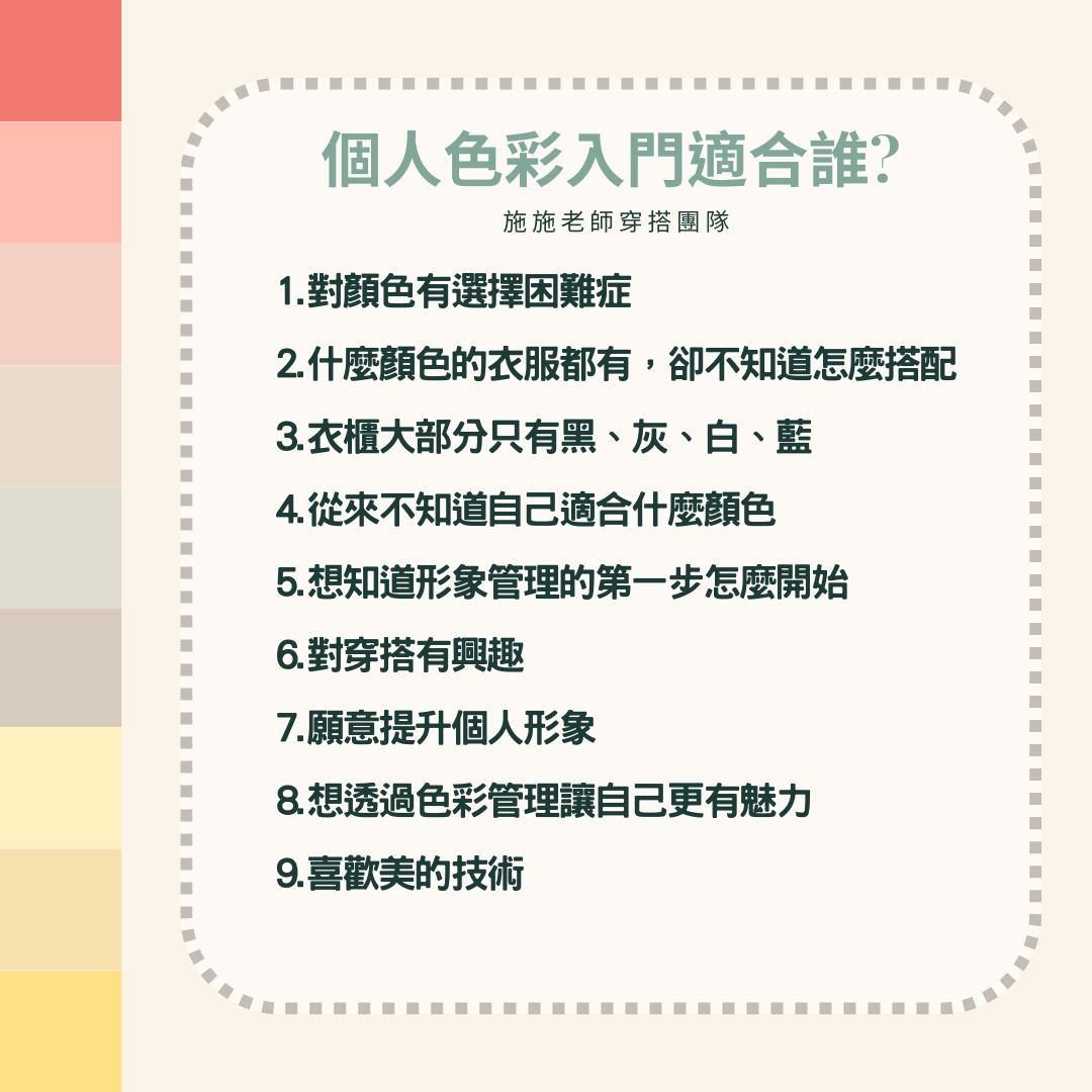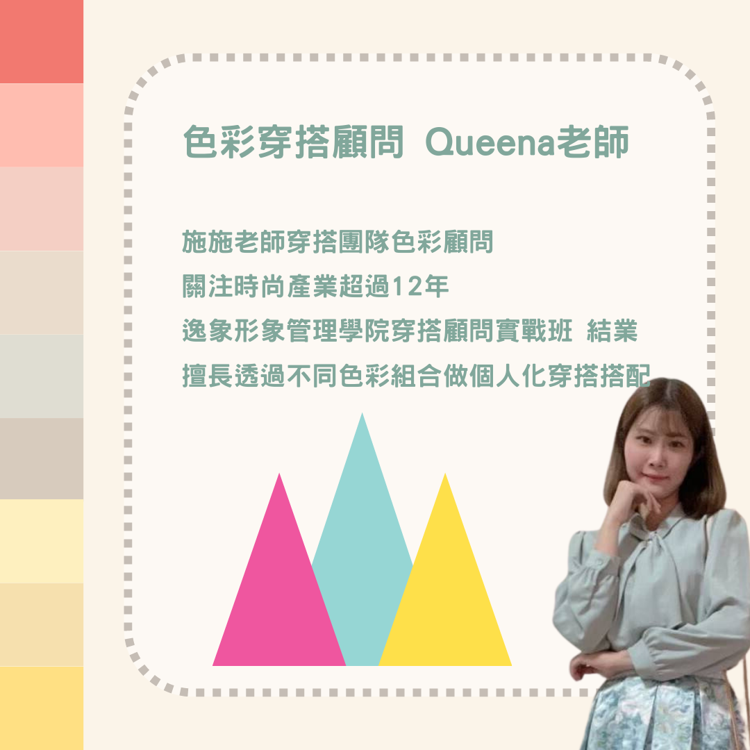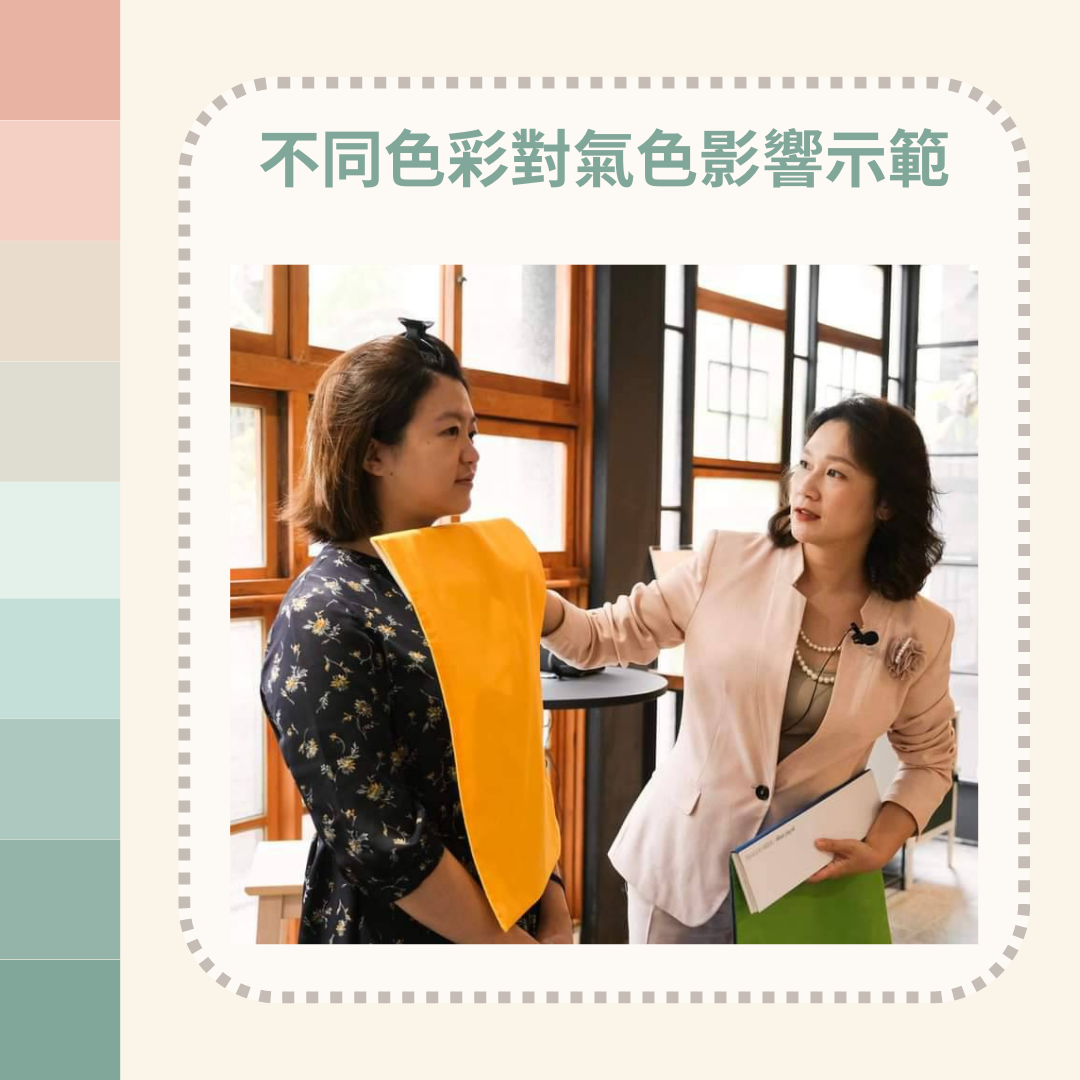 依"春、夏、秋、冬"分類而成的個人色彩,有色彩穿搭顧問Queena老師透過不同顏色的色布在你身上比對,區分出不同色彩在你臉上的變化, 幫助你瞭解與自身天然膚色最相襯的色彩群。