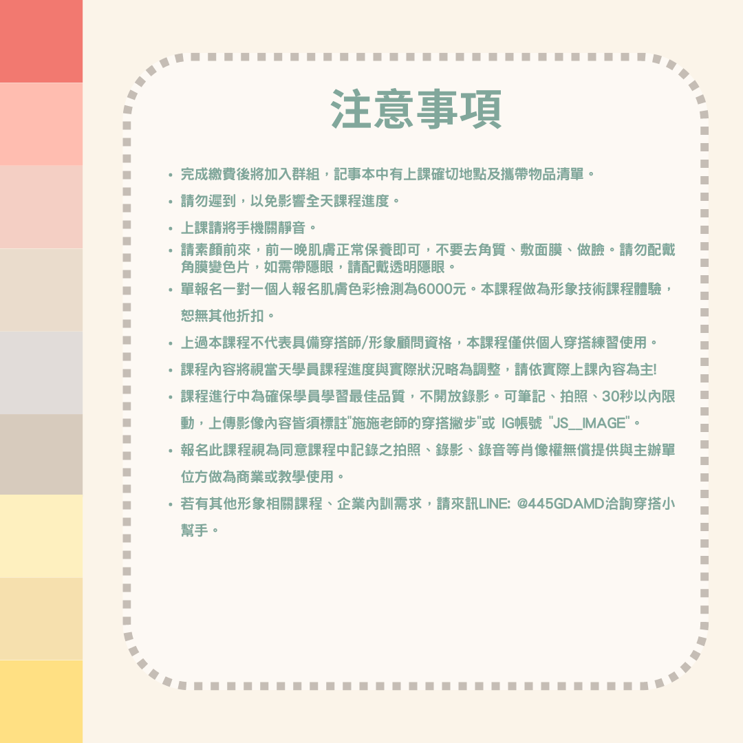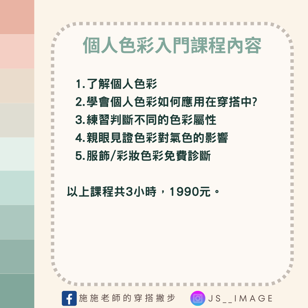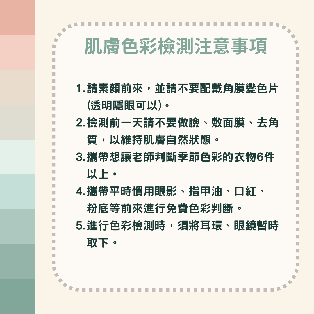 依"春、夏、秋、冬"分類而成的個人色彩,有色彩穿搭顧問Queena老師透過不同顏色的色布在你身上比對,區分出不同色彩在你臉上的變化, 幫助你瞭解與自身天然膚色最相襯的色彩群。