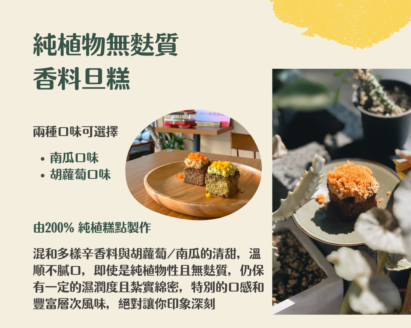 ▲混和多樣辛香料與胡蘿蔔/南瓜的清甜,溫順不膩口,即使是純植物性且無麩質,仍保有一定的濕潤度且紮實綿密,特別的口感和豐富層次風味,絕對讓你印象深刻
