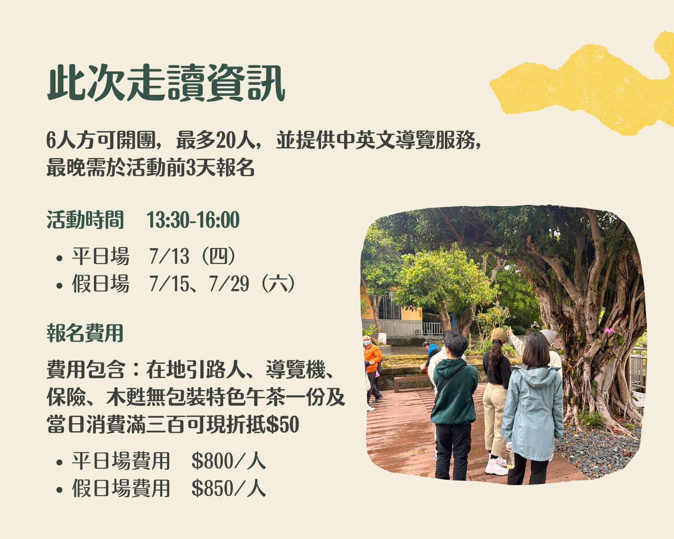 ▲6⼈⽅可開團,最多20⼈,並提供中英⽂導覽服務,最晚需於活動前3天報名
