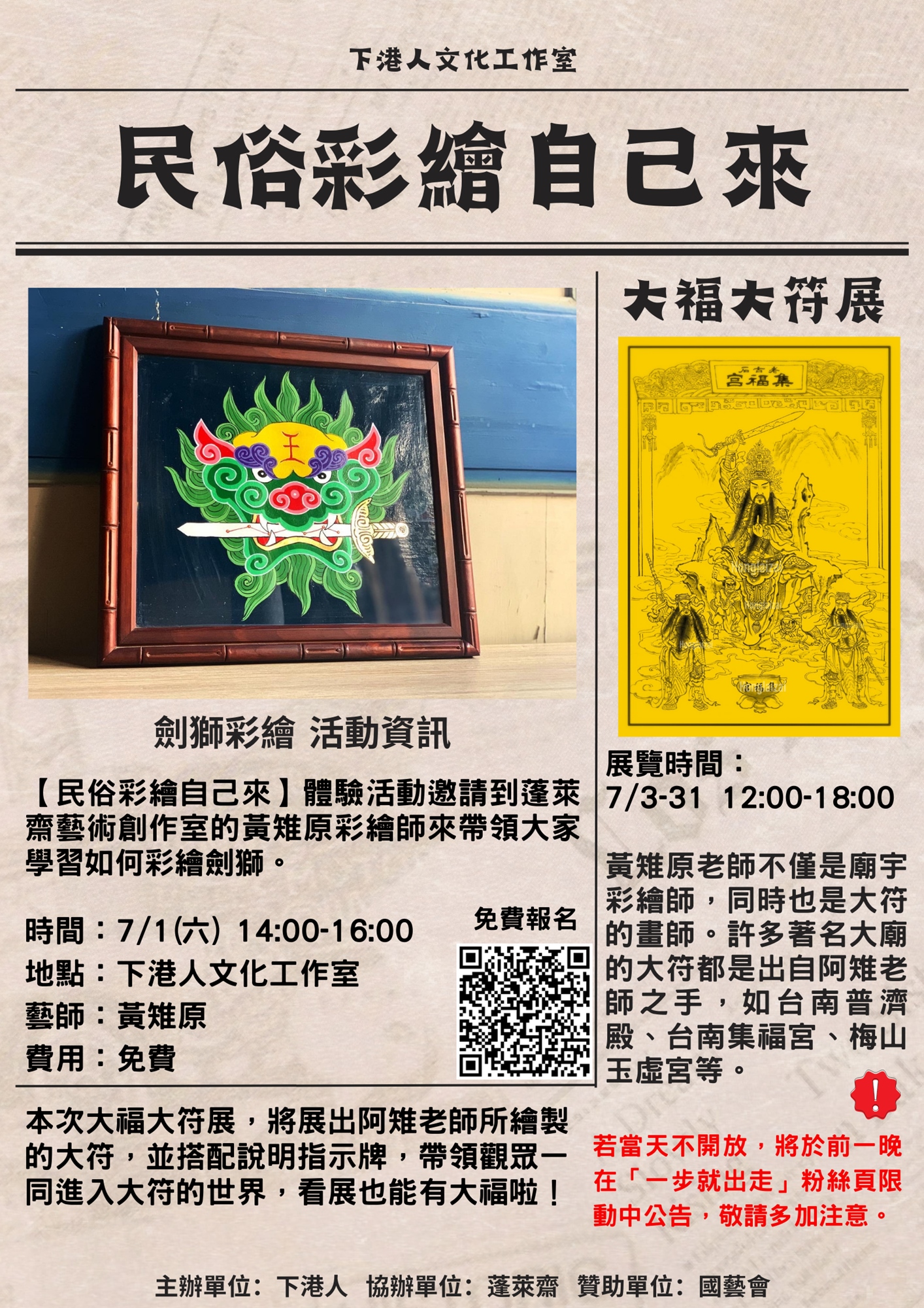 【民俗彩繪自己來】體驗活動邀請到蓬萊齋藝術創作室的黃雉原彩繪師來帶領大家學習如何彩繪劍獅。(體驗活動成果不含框)