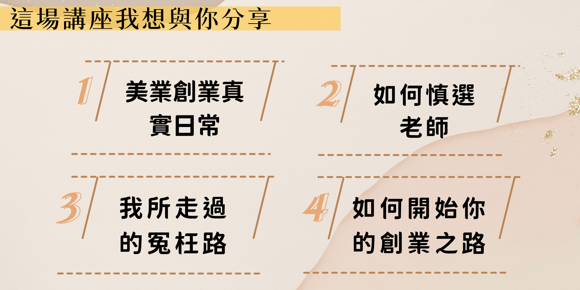 本次的講座會與你分享「如何踏入美業」、「少走冤枉路」、「不離職創業」等美業創業成功心法,並且有問必答,幫你釐清所有疑惑。