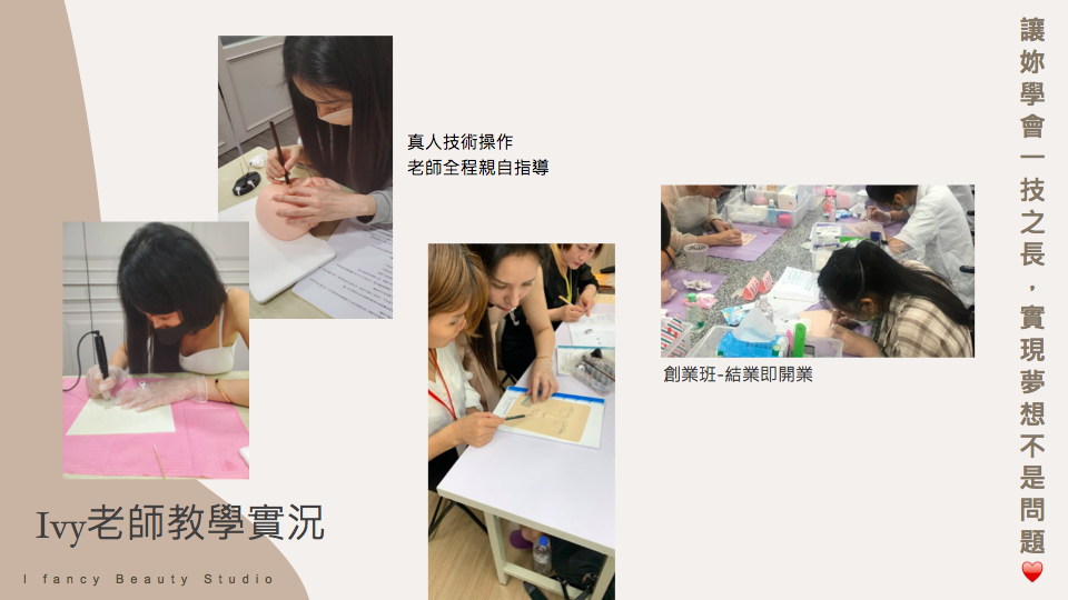 Ivy老師本身從事美業超過7年以上,實戰教學經驗多年課程中針對霧眉師的痛點:眉型設計、選色調色、選擇色乳品牌等術前術後客戶諮詢及服務都在創業課程中一一解析,課後還會有群組持續發問協助同學解決實戰上的問題。