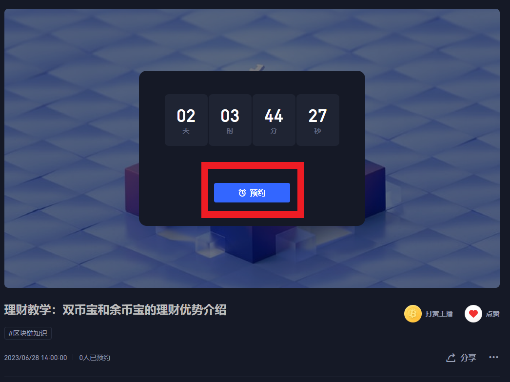 觀看直播,免費領取紅包,更有直播驚喜紅包不定時發放,在活動期間,去【理財教學:雙幣寶和餘幣寶的理財優勢介紹】的直播間觀看的用戶即可有機會抽取獲得限時紅包,名額有限,先到先得!
