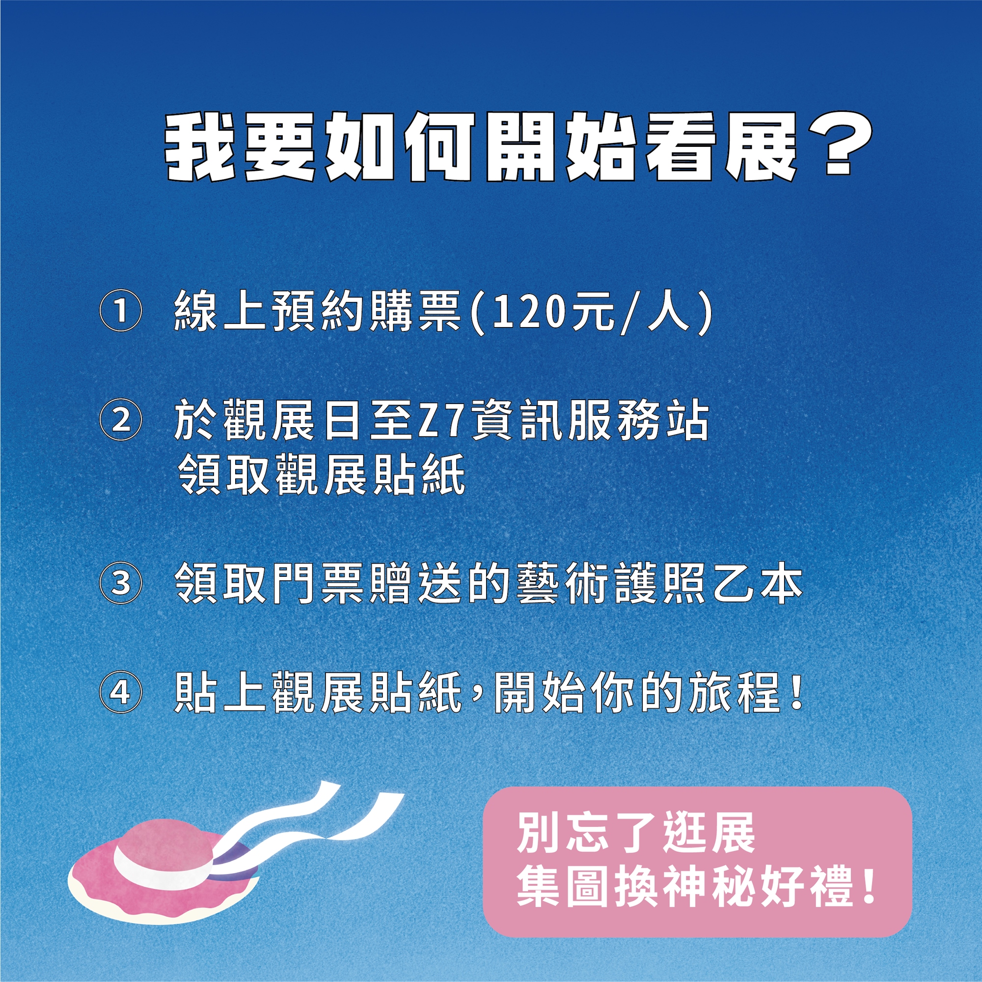 (一)參觀展覽需線上預約購票 (120 元 / 人 ),預約後請於觀展日至 Z7 資訊服務站(基隆市中正區正濱路34號)領取觀展貼紙,每張門 票皆贈送一本藝術護照。7-12歲半價:60元/人 (恕不提供藝術手冊,需現場加價購票)、6歲以下免費,建議11歲以上參與。