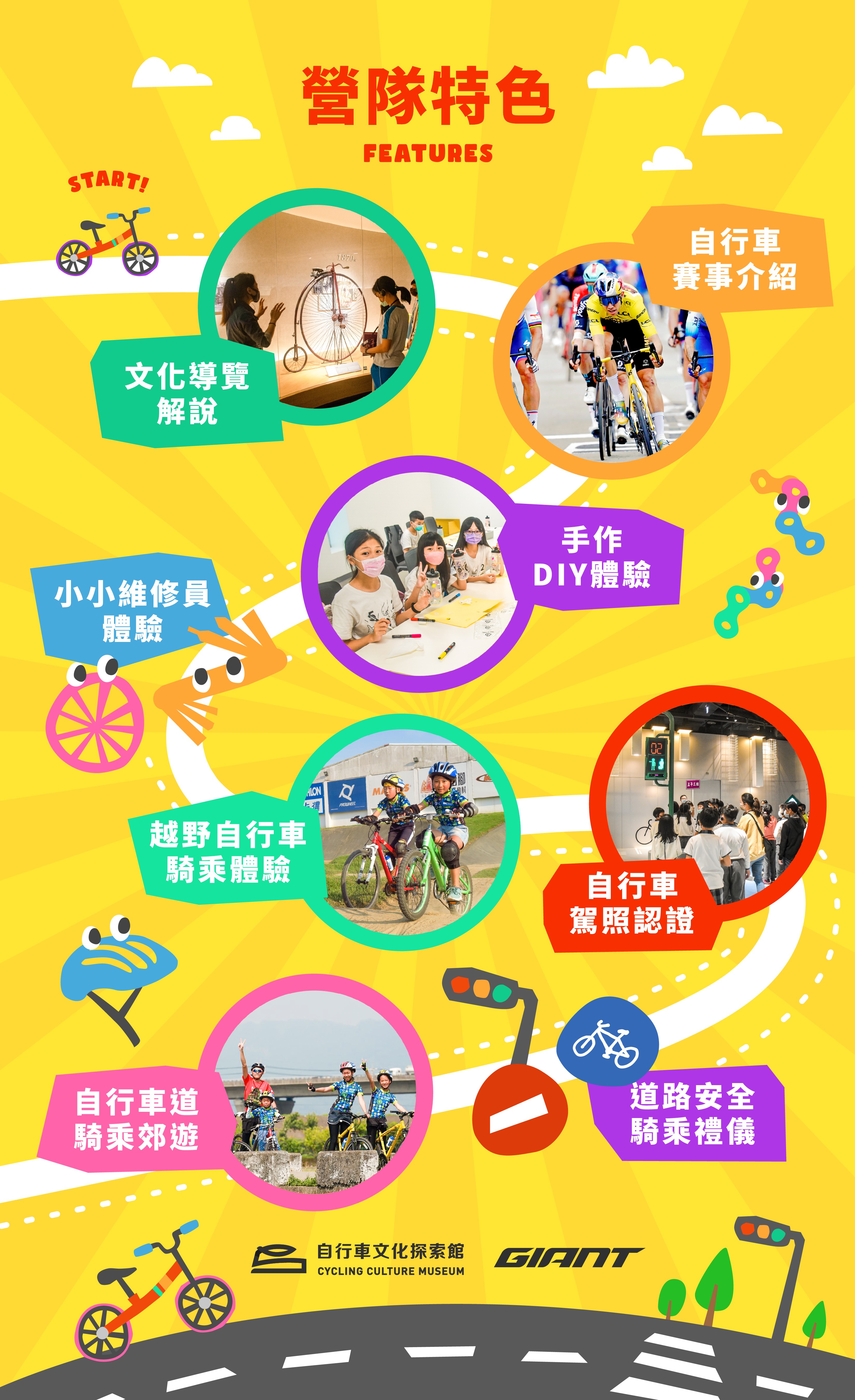 包含文化導覽介紹、各式自行車體驗應用、道路安全與騎乘禮節、自行車考照認證、簡易維修實作體驗等,讓孩子們有更多元的能力來探索世界,也能夠發揮自身影響力來啟發他人。
