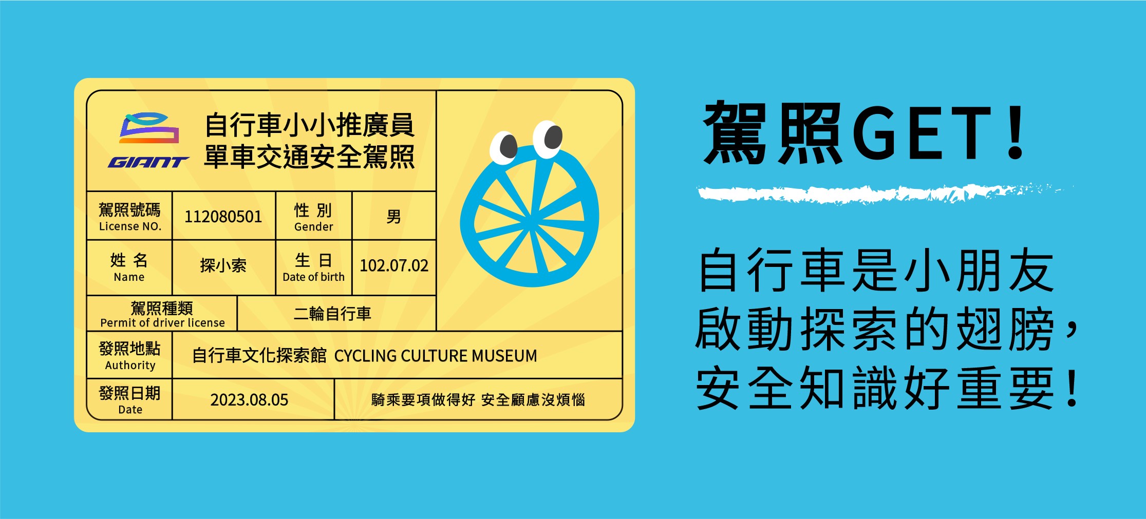 - 課程贈品:紀念車衣、單車手套、自行車水壺、自行車安全帽、自行車駕照、自行車推廣員結業證書、自行車文化探索館一般參觀體驗券2張。(總價值超過3,500元)學員憑「自行車小小推廣員證書」於有效期間內可無限暢遊免費進入探索館常設展區。