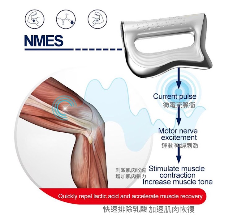 ★ 微電流(NMES)將低電頻電流發送到皮膚和脂肪層,以刺激更深的肌肉組織和運動神經,亦可使用來刺激不活動的肌肉以預防肌肉萎縮。
