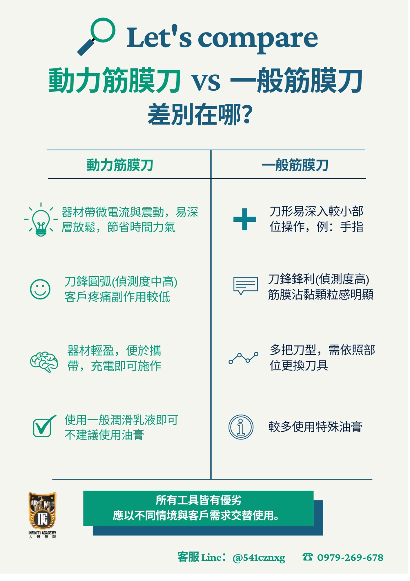 動力筋膜刀系統,包含理論講述與實際操作,課程中會說明「全身可操作的部位與手法」,包含操作方法/角度/速度/方向等要素,並說明適應症與禁忌症。