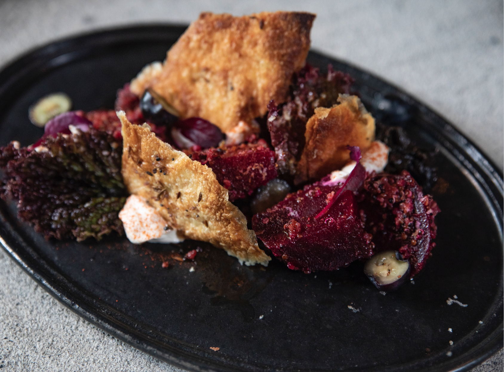 花塚|是一款以甜菜根作為基底的紅色地景沙拉,既開胃又能令人飽足,由烤甜菜根、水煮藜麥、日曬番茄香料醬、香料烤餅、腰果酸奶醬,交織出各種層次的風味。