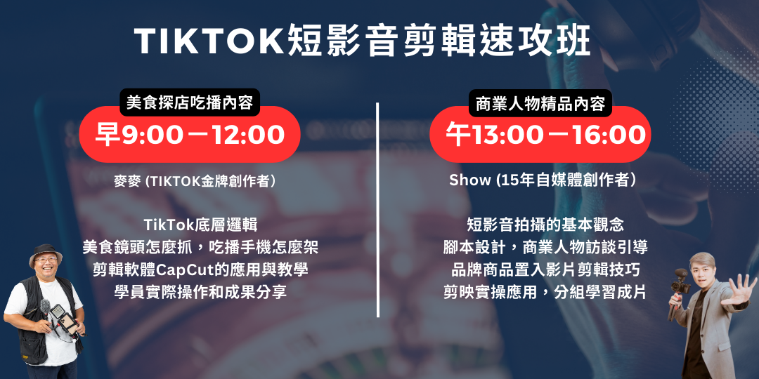 6小時手機剪輯速成班,一次學會兩種短影音內容設計。本次課程共分上午、下午兩個場次,每場3小時,根據課程的不同,指導學員透過手機app下載『剪映』或『CapCut』的操作,讓每位學員可以在最多6個小時內快速成片。