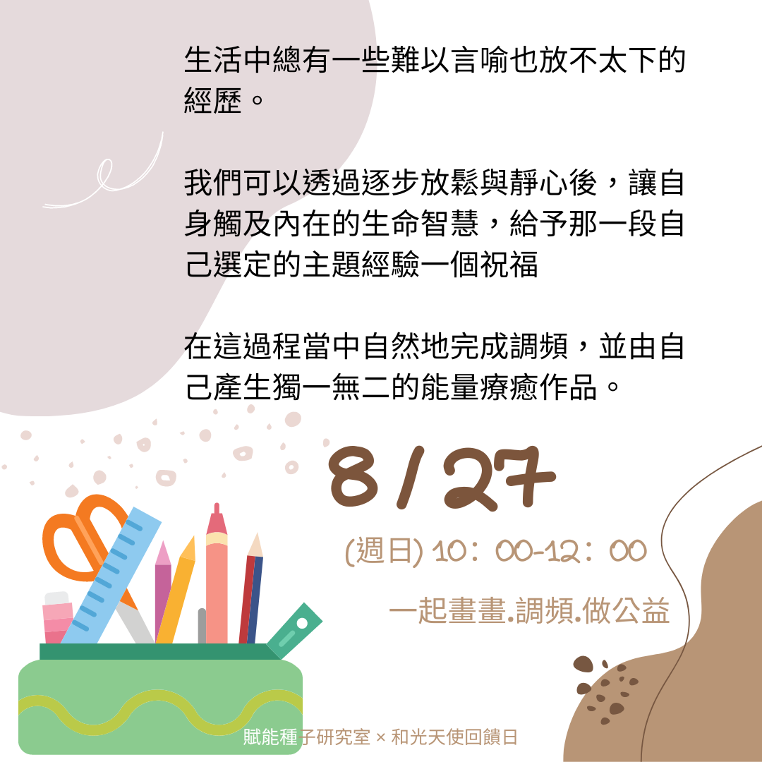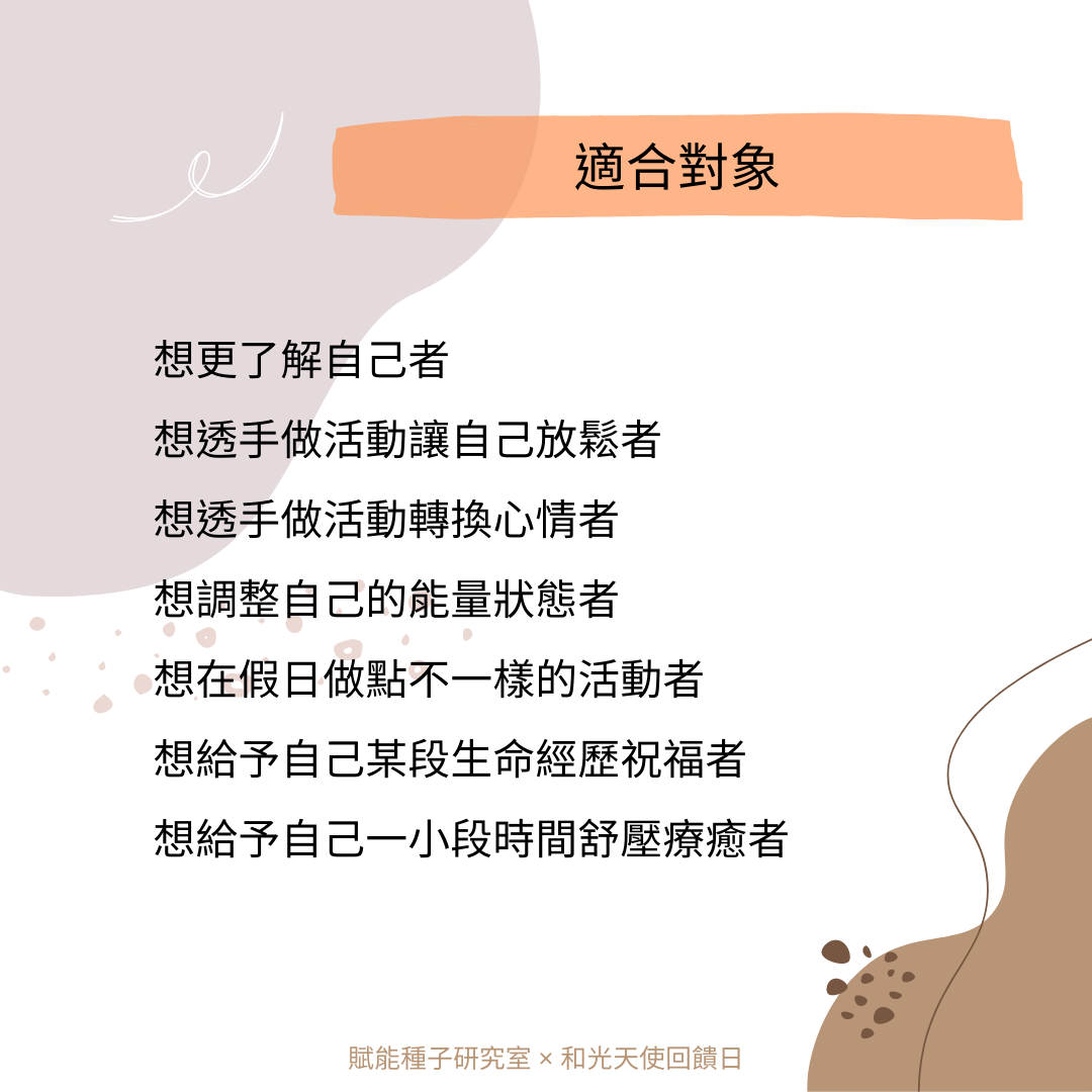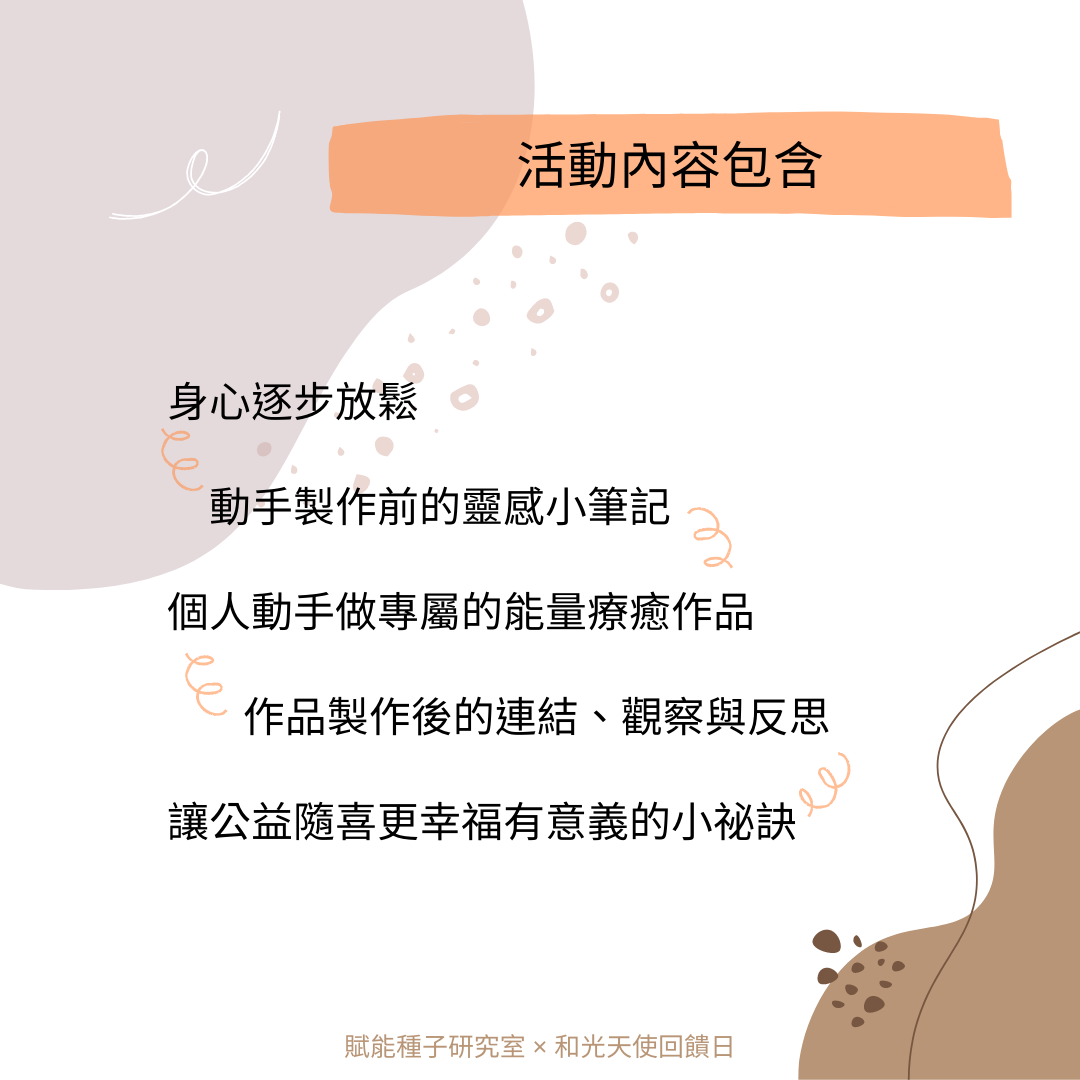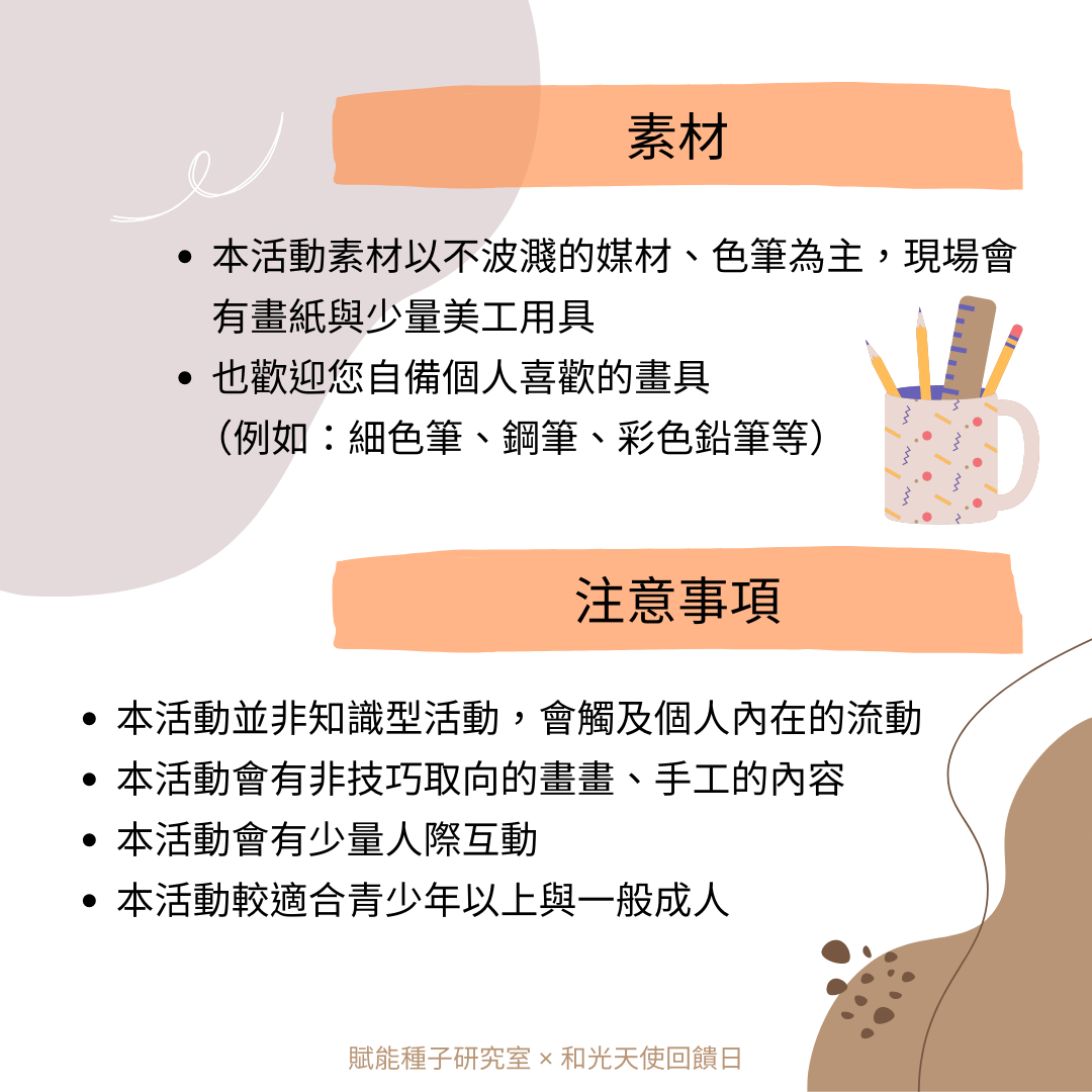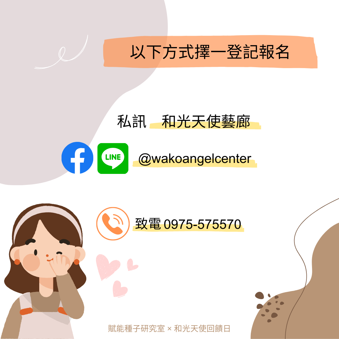 報名 請您私訊 FB、Line: @wakoangelcenter或致電 0975-575570 登記★ 若您填寫ACCUPASS的報名,僅為GOOLGE日曆可以連動和有系統信件提醒活動時間,請您務必用以上方式聯繫「和光天使藝廊」才算是完成報名喔! 費用 免費。由學員自行斟酌公益隨喜,當日活動全部隨喜金額扣除活動必要成本後,會請藝廊一起捐出給7間公益團體(主要是育幼院)。感謝您自我成長的同時也散發您的愛心。