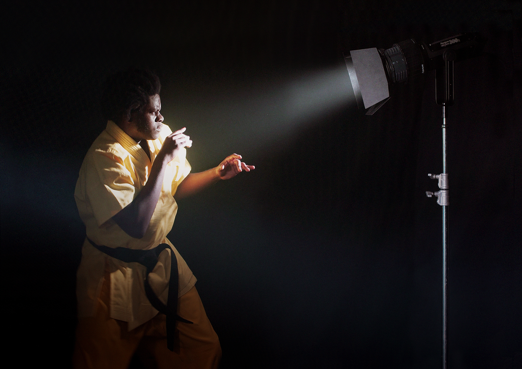 光是縈繞攝影技術的幽靈。然而在與光協調的過程之中,很顯然的,人類的偏見也在不自覺的情況下悄悄地潛入這場賽局。實驗錄像作品《打光》嘗試透過跨學科的提問重新釐清隱藏在技術發展中的歧視性問題。作品由三條主要敘事構成,包括與多哥的專業攝影師探討如何透過打光來彌補器材對深膚色曝光的不足,以及與專門開發臉部辨識的工程師詢問他們是怎麼打造在非洲極受歡迎的相機演算法。此外,藝術家更嘗試使用70年代主流的柯達埃克塔克羅姆膠卷,以當時著名的黑人工夫明星吉姆·凱利在李小龍電影中的形象製作一部帶有剝削電影風格的工夫片。