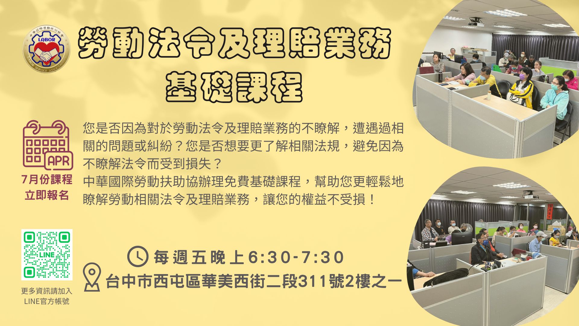 【中華國際勞動扶助會】辦理免費基礎課程,幫助您更輕鬆地瞭解勞動相關法令及理賠業務,讓您的權益不受損!