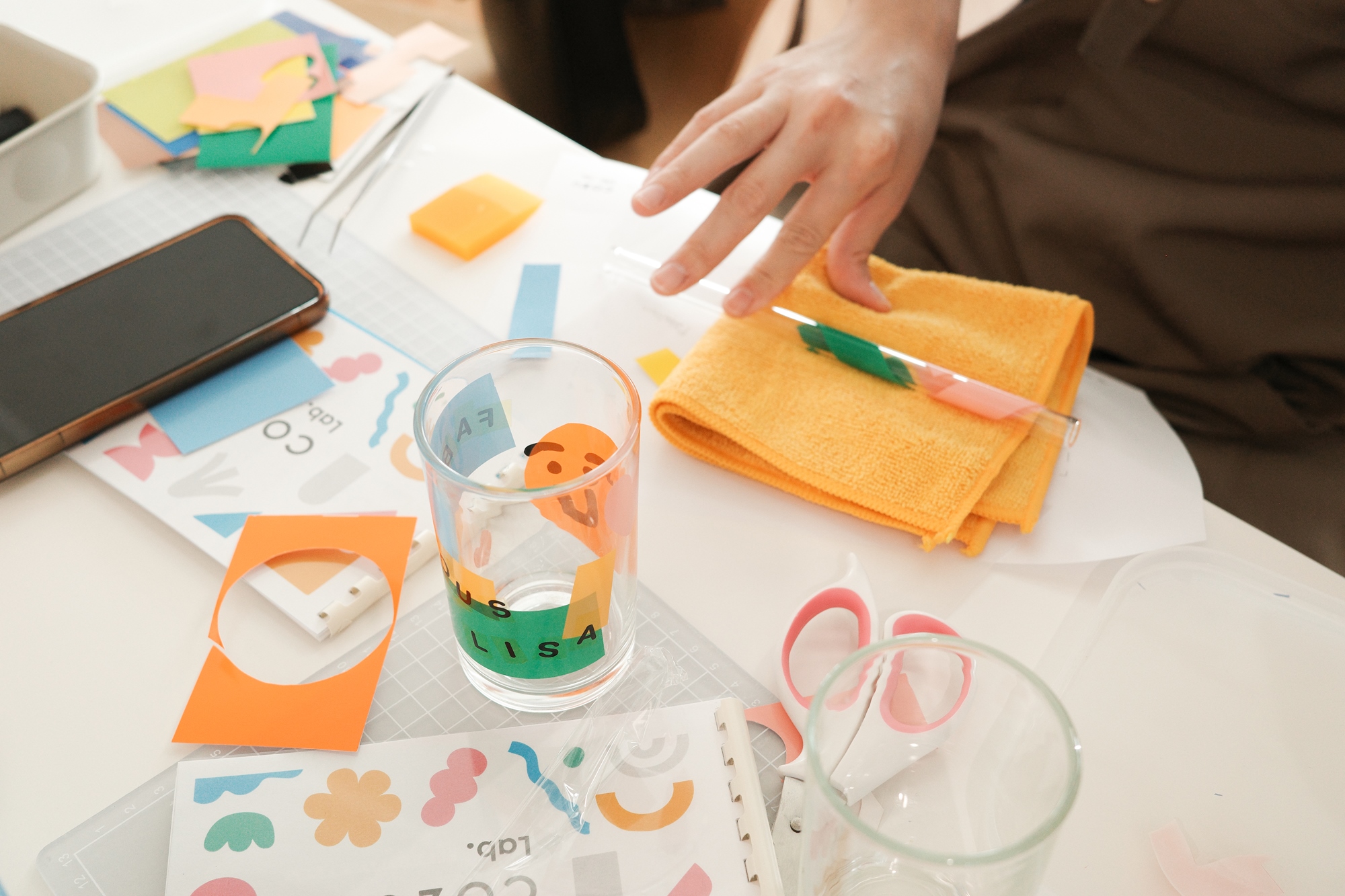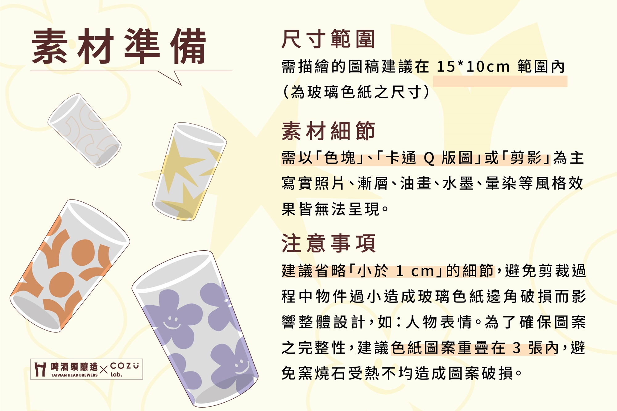 COZU Lab. 應用傳統玻璃印刷工藝,將原本適用於大量生產的玻璃色紙,變成好玩的拼貼色紙。並搭配可愛的插圖、字母以及特色圖像,讓學員拼貼出專屬於自己的玻璃杯!