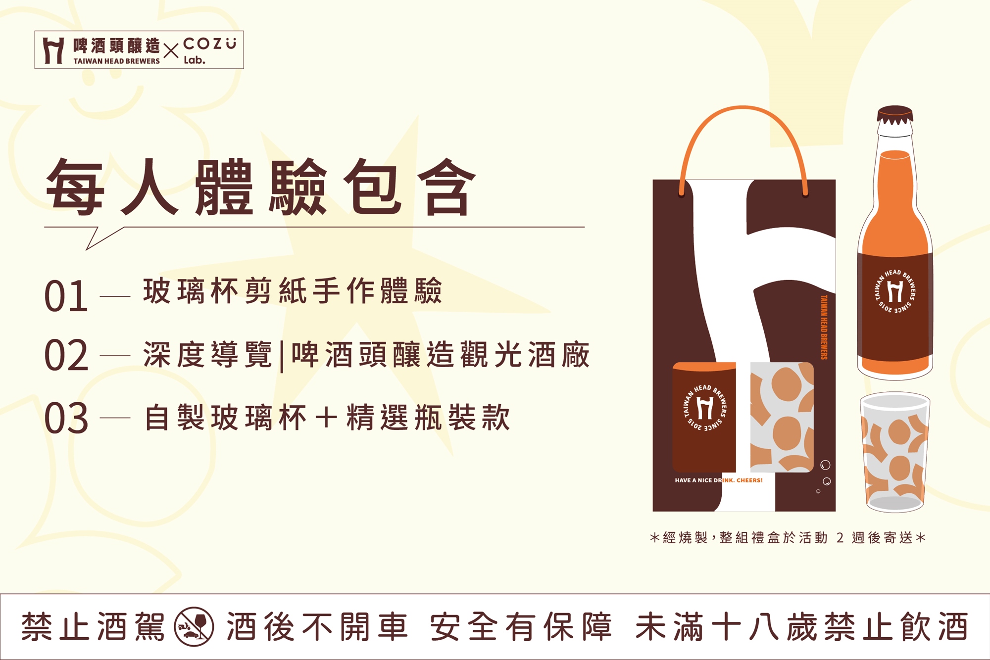 *需等待 2 週時間燒製,將可以收到玻璃杯啤酒套組(親手製作的玻璃杯+啤酒頭釀造精釀啤酒 1 瓶)