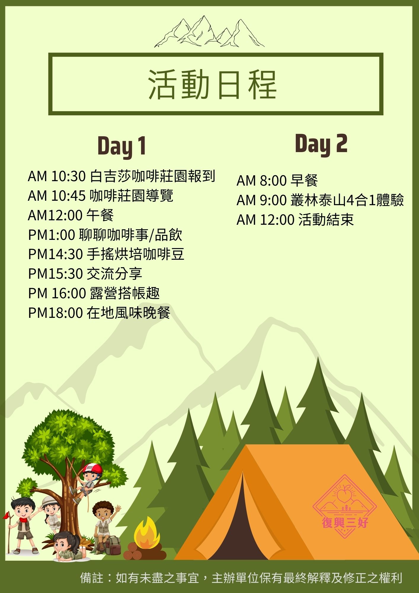 費用包含:活動、中餐、晚餐及保險