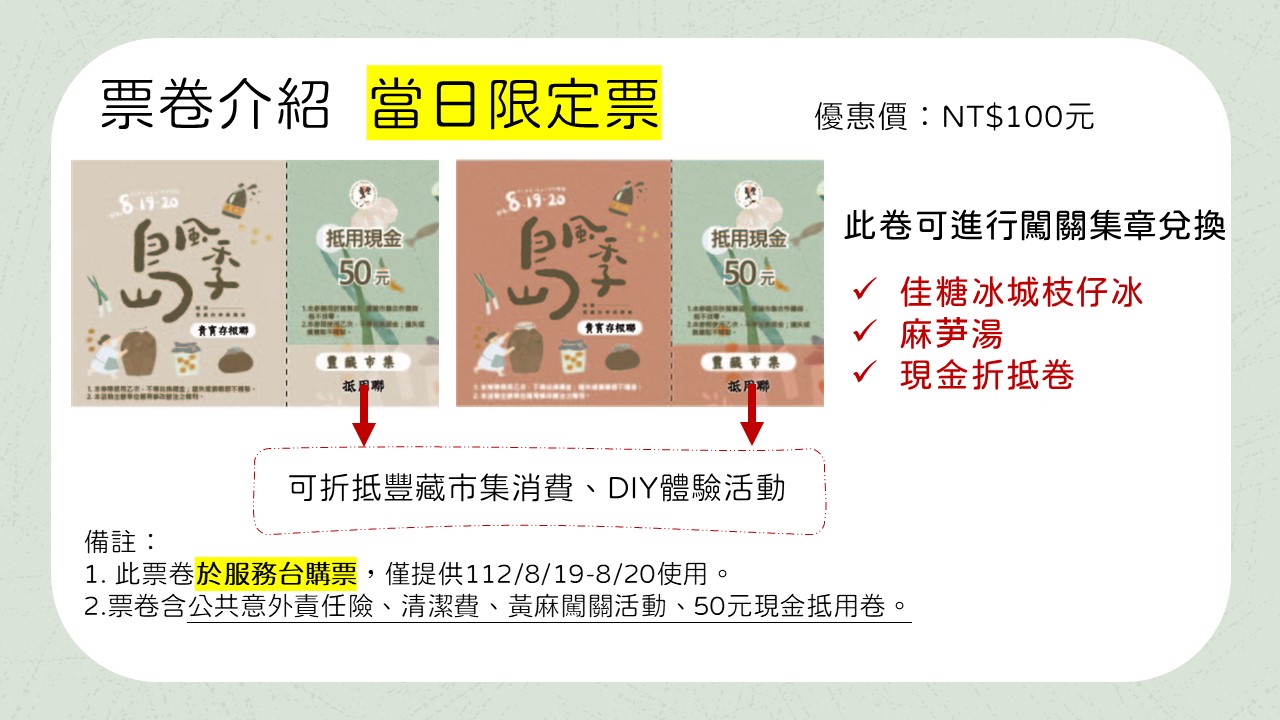 1.現場服務台: 半日體驗套票 NT$100元 (僅限當天購買)