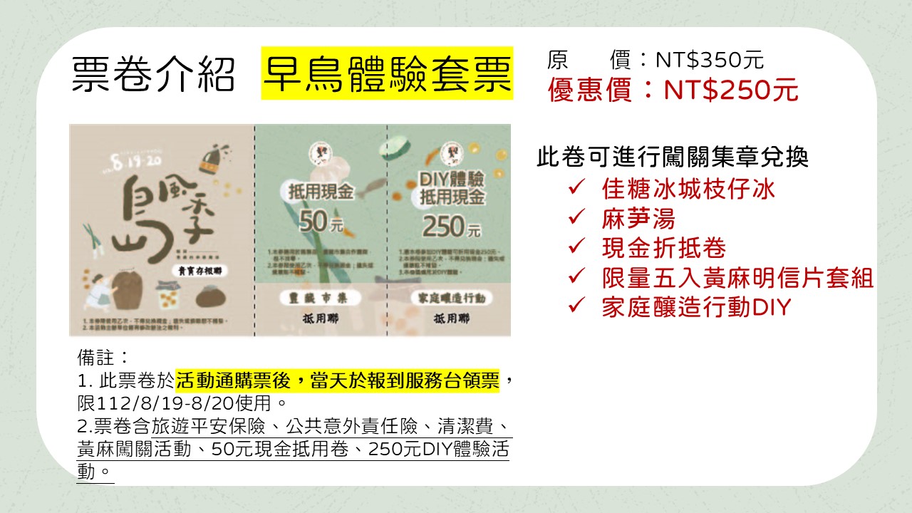 3.活動通 線上購票: 早鳥體驗套票 NT$250元
