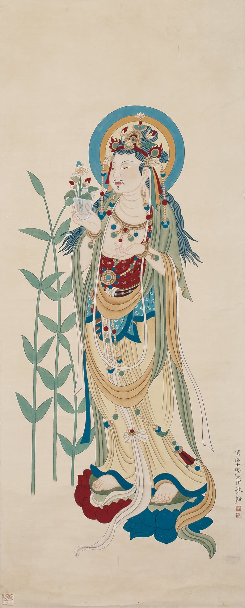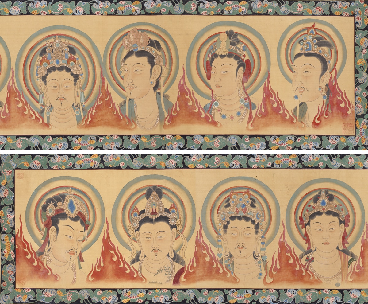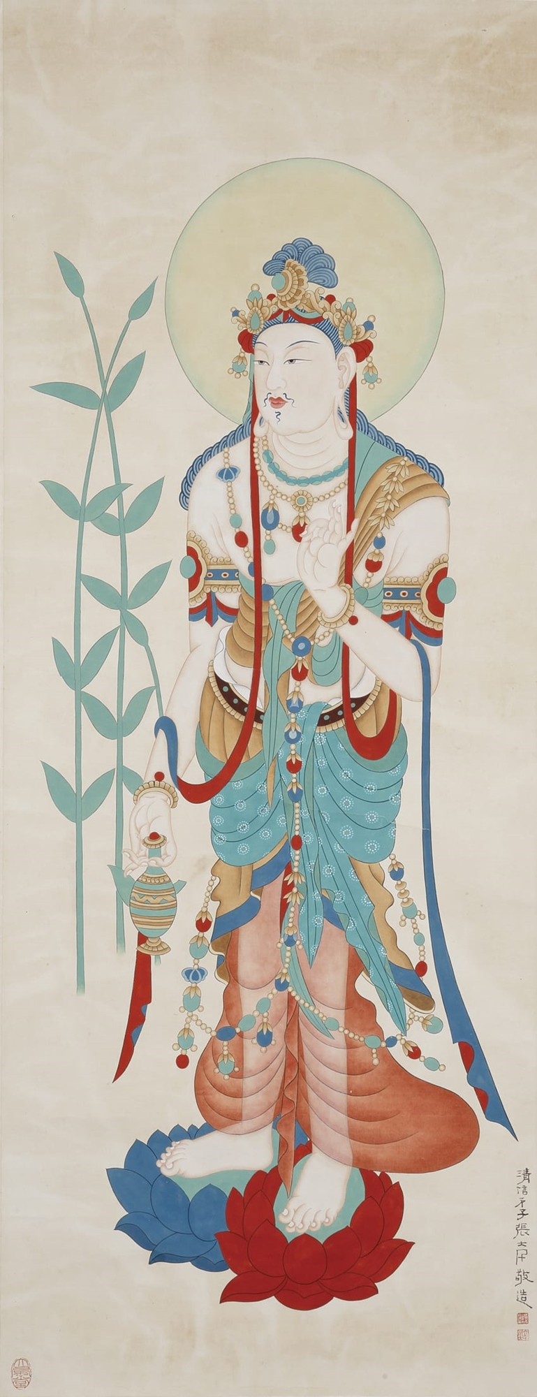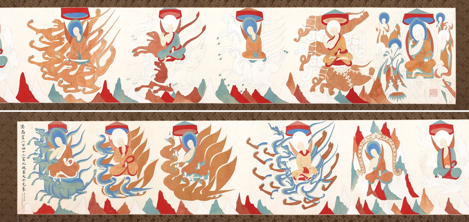 五十歲以前,張大千展現最大氣魄的壯舉,莫過於民國卅至卅二年(1941-1943)的「敦煌之行」了。歷時兩年七個月的潛心臨摹,他率領門生和青海喇嘛畫師共同完成了將近三百餘件敦煌壁畫摹本;目前張大千敦煌摹本的典藏重鎮,莫過於臺北的國立故宮博物院和成都的四川博物院,另外,長流美術館也收藏了十三件摹本,於私人美術館中相當難得。