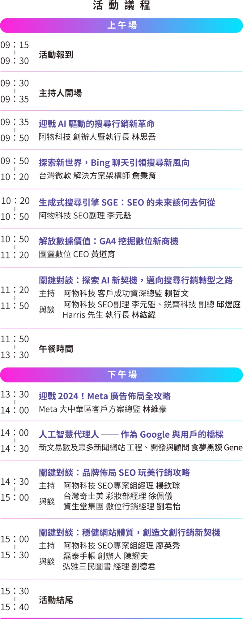 過去三年全球企業加速數位轉型,零接觸商機使得行銷模式與技術持續更迭創新,尤其隨著生成式 AI、ChatGPT 與其他更多 AI 應用的興起,也大幅改變用戶搜尋行為及內容資訊形式,從過往文字搜尋,圖像、影音等內容的崛起,及影響力行銷與社群商務趨勢引發行銷新世代變革。本屆 iSearch 搜尋行銷年會邀請到超強卡司,包括 Meta、Microsoft、阿物科技、圖靈數位、小黑老師 邱煜庭、食夢黑貘 Gene Hong、Harris 先生等產業達人與行銷專家,為您解析 AI、SGE、SEO、GA4、內容數據、社群廣告等議題,更邀請到肌膚之鑰、KISSME、磊泰手帳、三民圖書 分享品牌實戰策略,以及如何因應數位行銷大進化,並從不同維度和形式的數位連結來接觸消費者,進而驅動消費、帶來成長。
