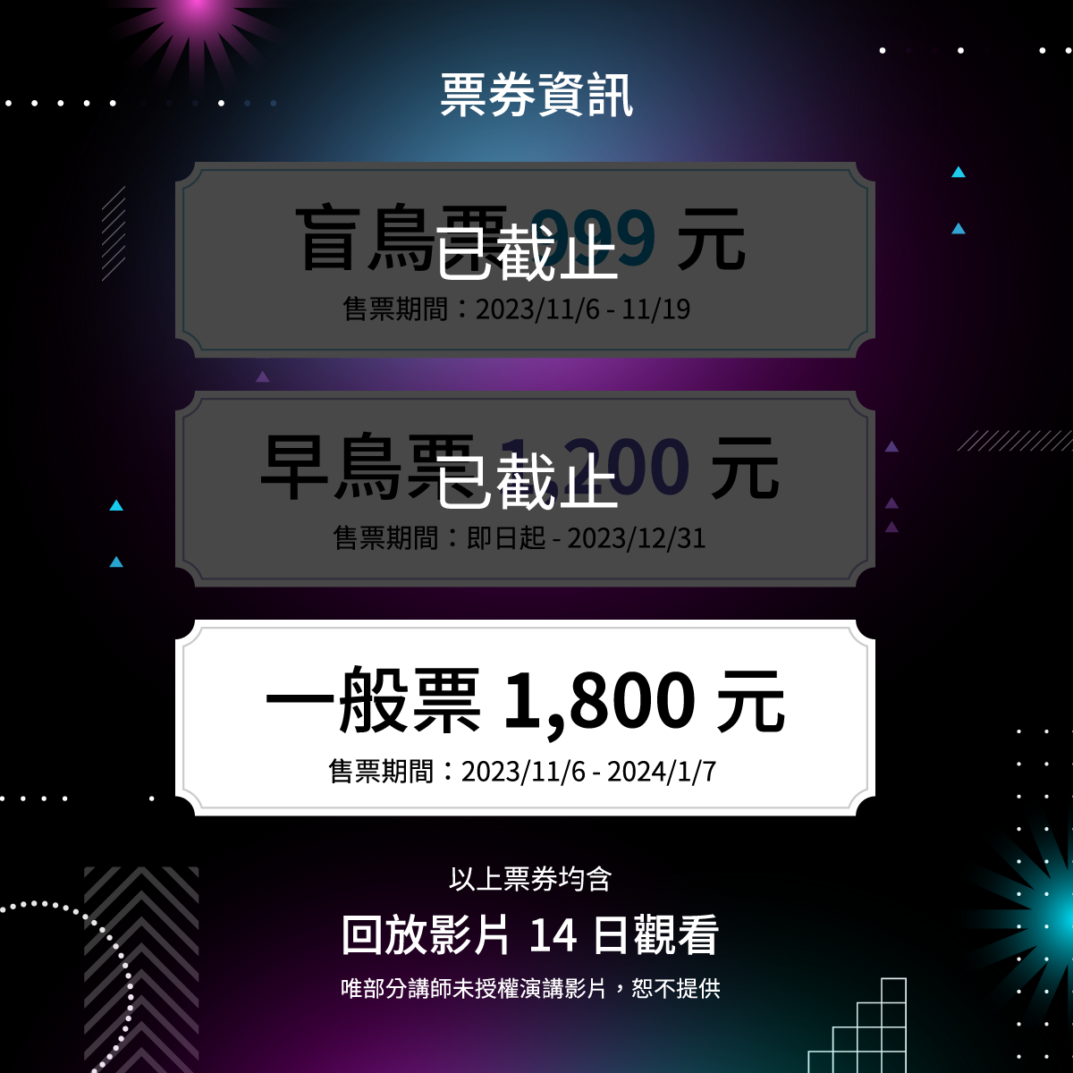 ● 所有購票者均可於活動結束兩週後收到回放影片連結,於發送影片連結日起算14天內可重複觀看