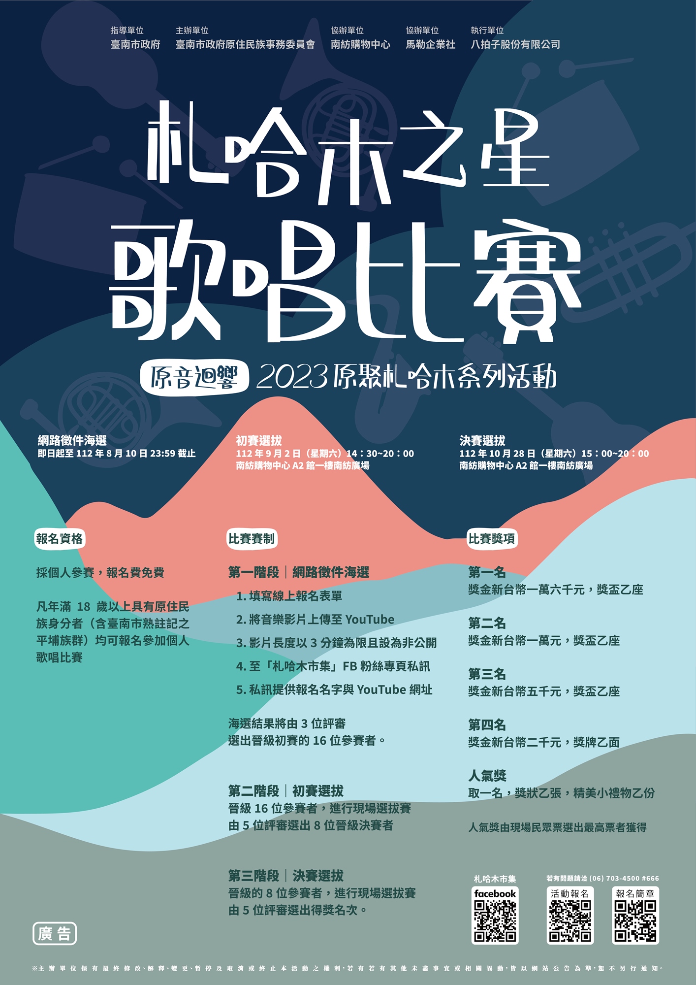 ❚ 報名資格:凡年滿 18 歲以上具有原住民族身分者(包含臺南市熟註記之平埔族群)均可參加「個人」歌唱比賽。