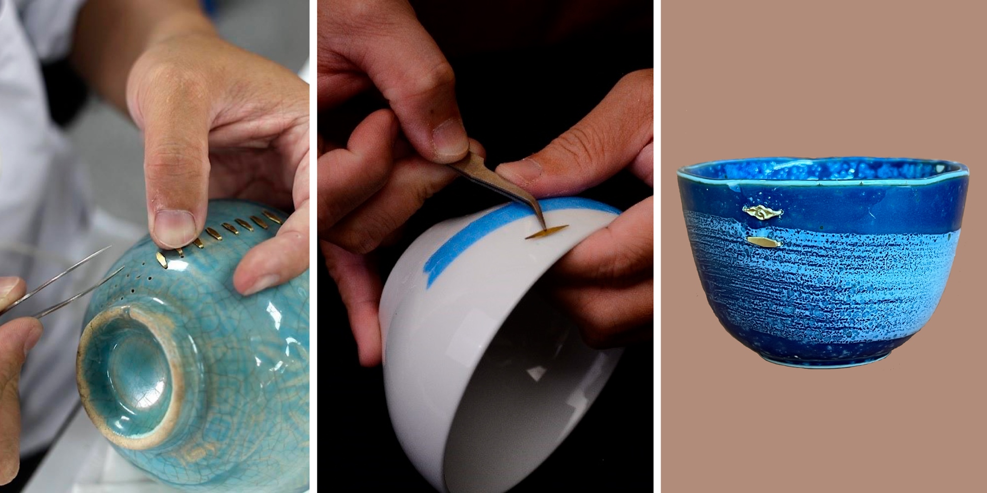 金繕是用天然的漆黏合器皿,鋦瓷則是用釘的做法恢復碎裂的器物。日本還有一個著名的故事與修復有關呢!相傳15世紀日本一位將軍非常喜愛茶器,他將一顆心愛但破裂的茶器送到中國修復,回到將軍手上時,茶器用金屬釘固定了。但將軍不滿意,希望日本修復師再修復,而出現了以漆黏合、塗上金粉的作法,後來這項工藝也可以在漆器上看到,日本稱作金繼。雖然金繕/金繼因日本工藝而聞名,不過這項修復技術在其他國家例如中國、越南和韓國,也很常見。