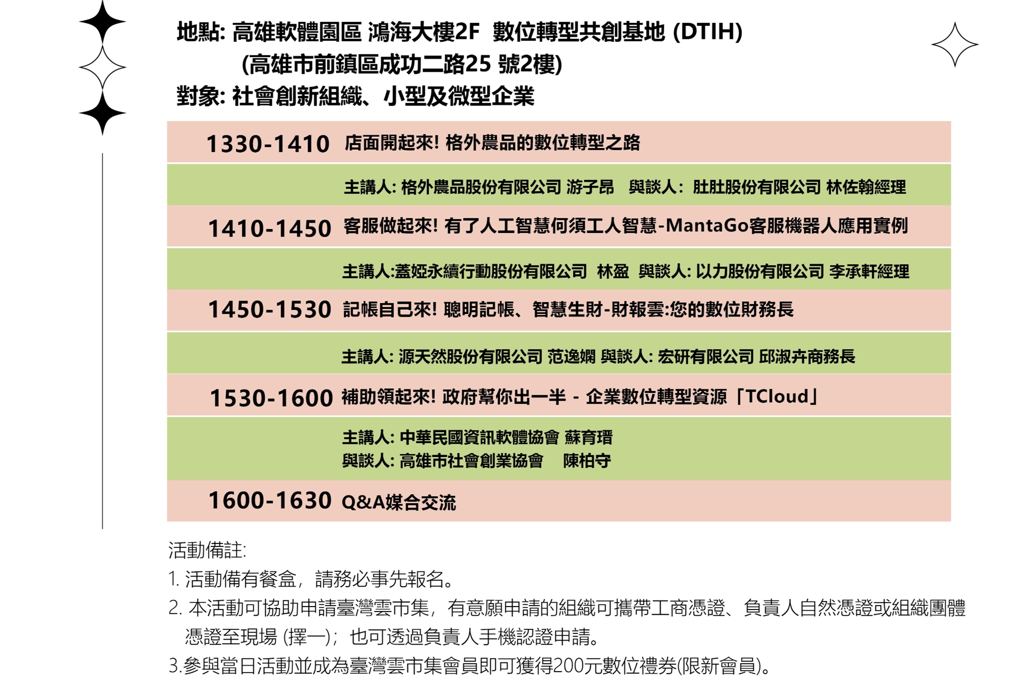 這次的活動我們除了邀請到讓數據全集中在單一平台的肚肚智慧點餐系統、能協助在Line和Facebook建立AI機器人的MantaGO、以及能夠簡化公司帳務,快速掌握財務現況的財報雲,以及未來走在ESG路上一定要認識的社會創業家們齊聚一堂,提供你實用的建議與見解,幫助企業更明確地選擇適合自家的數位工具,更協助大家快速取得政府補助資源3萬元