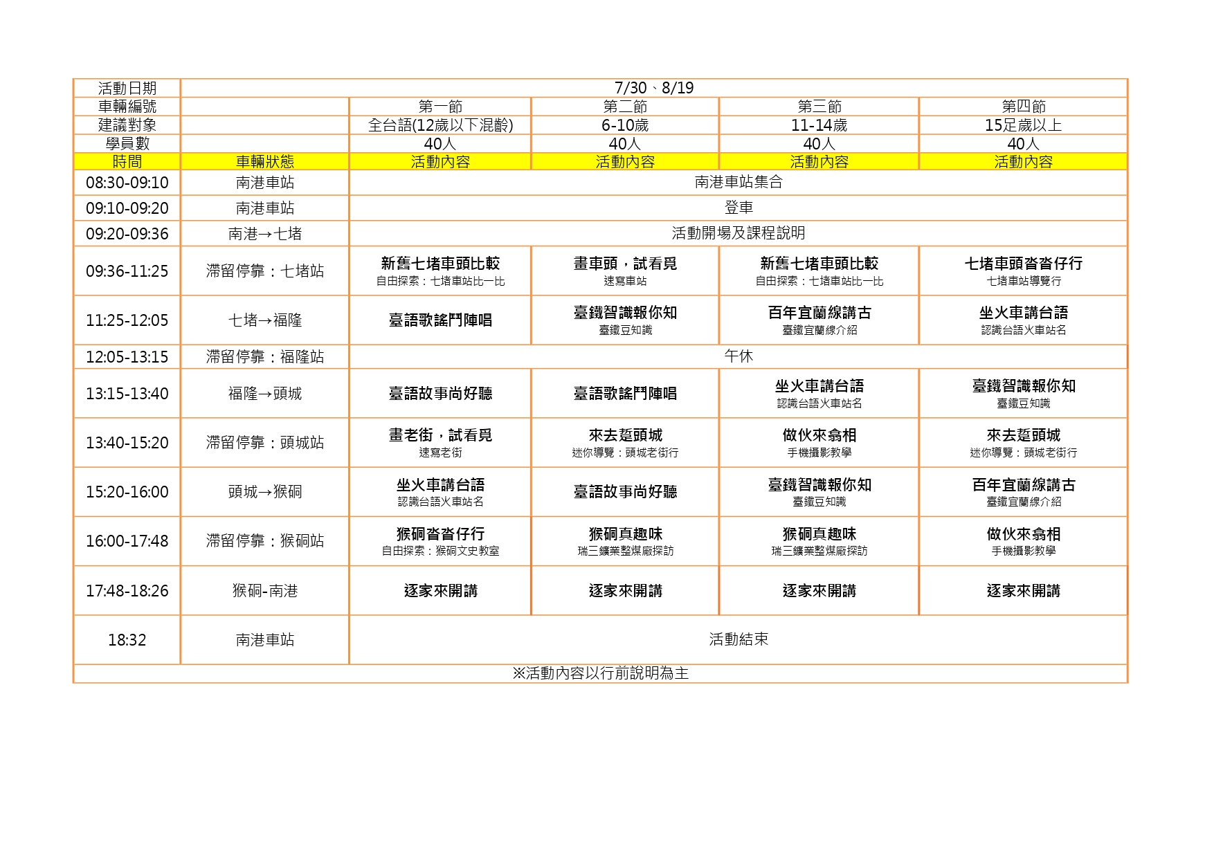 1.夏日營隊專列之運行及各站停靠時間以臺鐵最終調度安排為準。