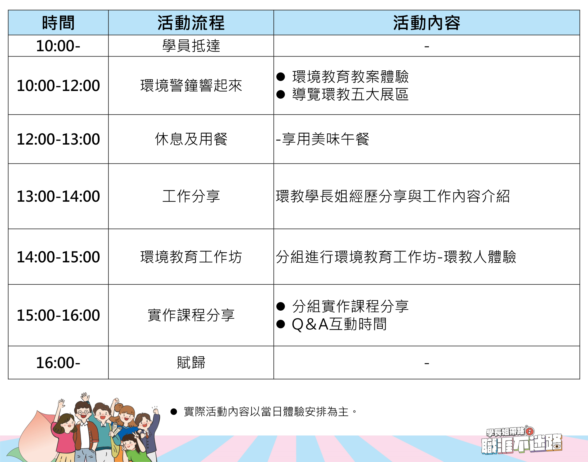 - 活動皆全程免費,並提供餐食、保險及接駁。