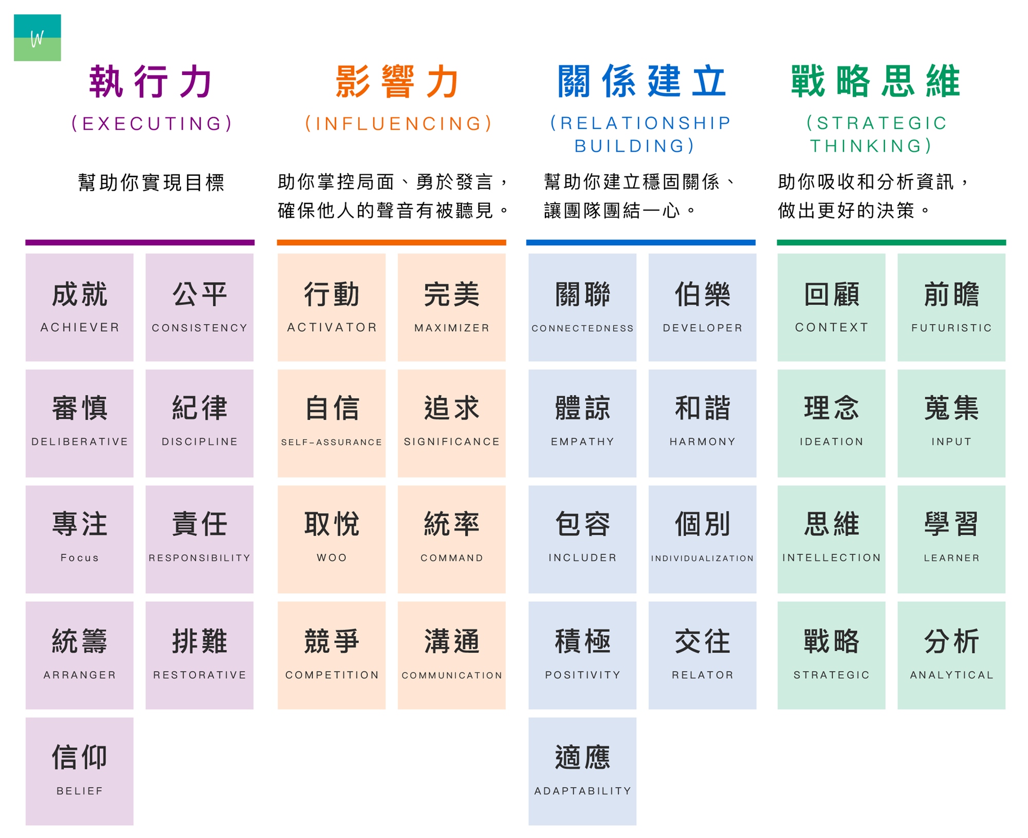 34 項天賦,又可以分成四大領域: