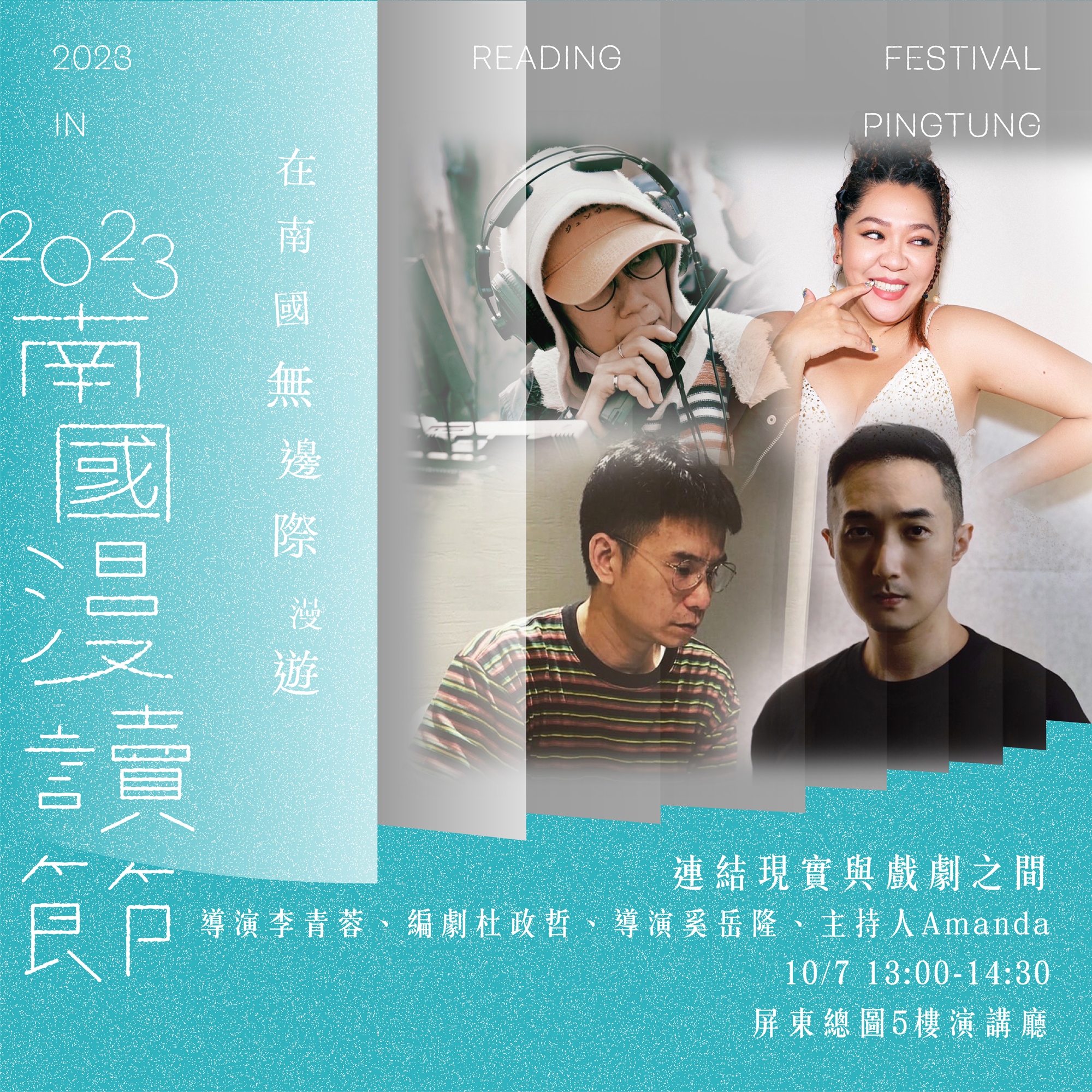 2023南國漫讀節特別邀請台灣三位重量級的講者,包括拍攝「花甲男孩轉大人」的導演李青蓉、「華燈初上」編劇杜政哲、「女鬼橋」導演奚岳隆等共同分享,並由主持人Amanda穿針引線,從編劇、導演的角度來分析,現實生活與戲劇之間,如何產生關聯。