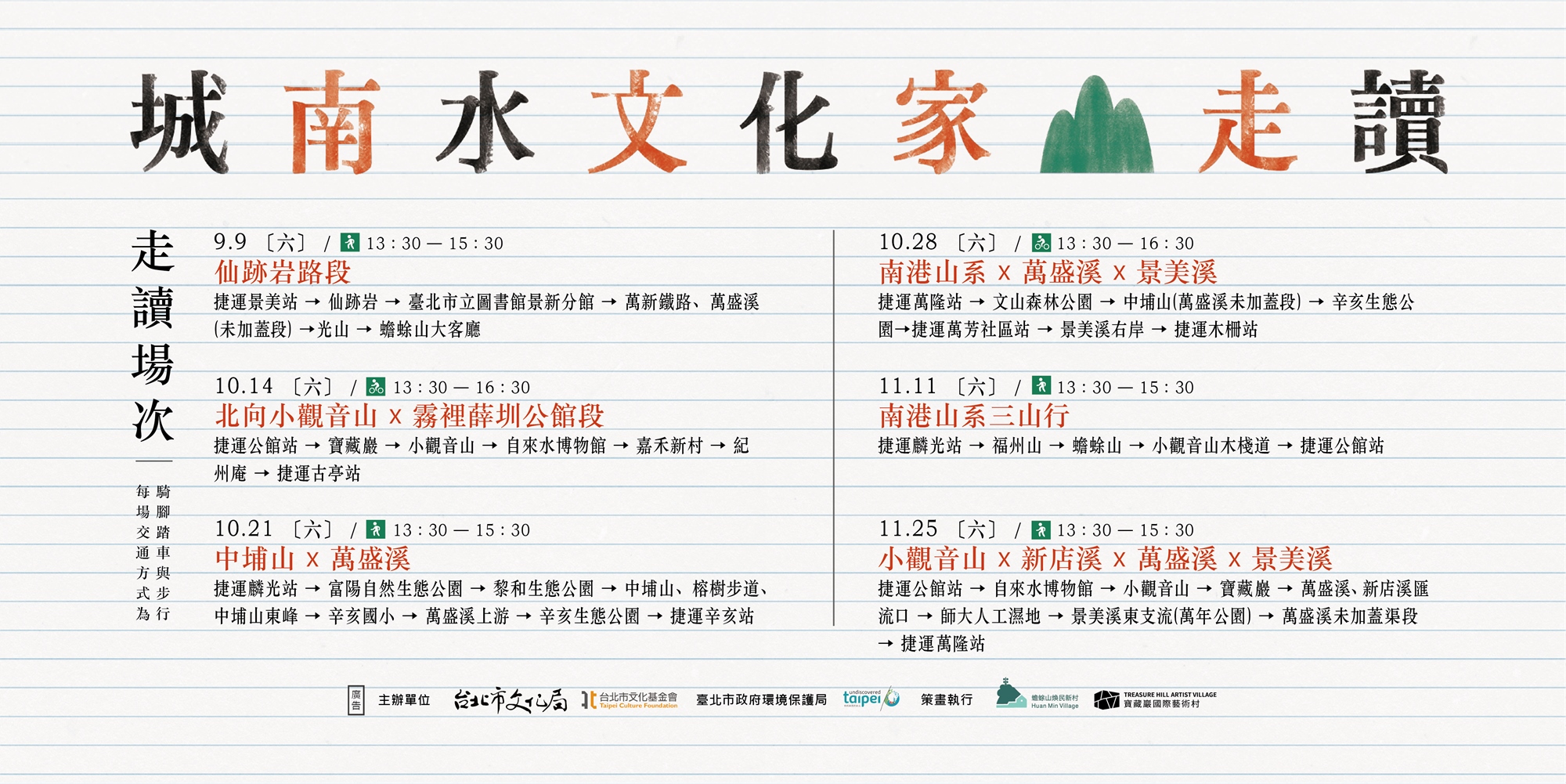 10/14(六) 13:30-16:30 | 北向小觀音山+霧裡薛圳公館段 13:30捷運古亭站8號出口 騎腳踏車+步行 | 捷運古亭站>紀州庵>嘉禾新村>自來水博物館>寶藏巖>小觀音山木棧道>捷運公館站 周邊活動:嘉禾新村 童拾記趣 眷村文化節 |