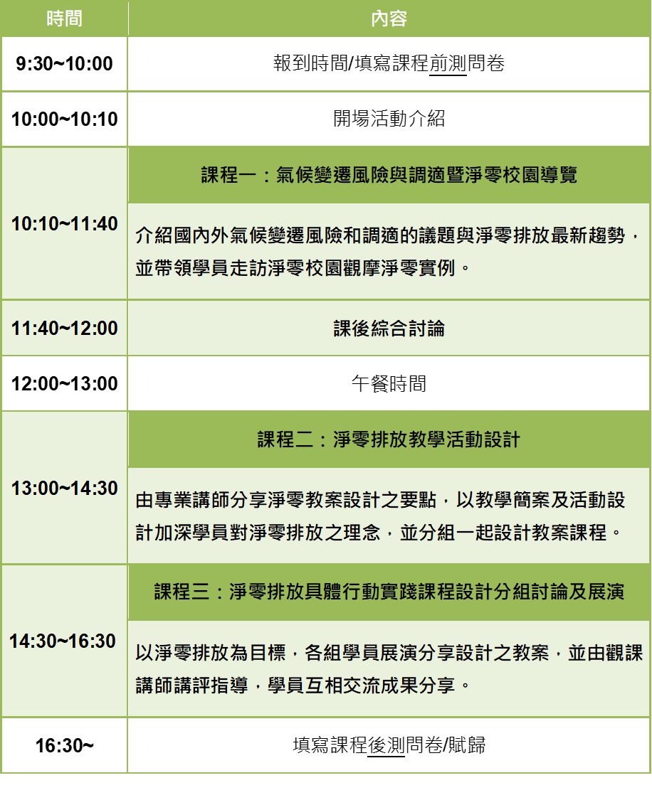 為促進臺灣邁向2050淨零排放目標,課程向學員介紹社區的氣候變遷風險與調適,認識目前國內外案例與淨零排放議題,並帶領學員實地走訪永續校園觀摩實際範例,並邀請專業環境教育教師說明與指導淨零排放教案設計與成果展演,讓我們一起推廣2050淨零排放目標!