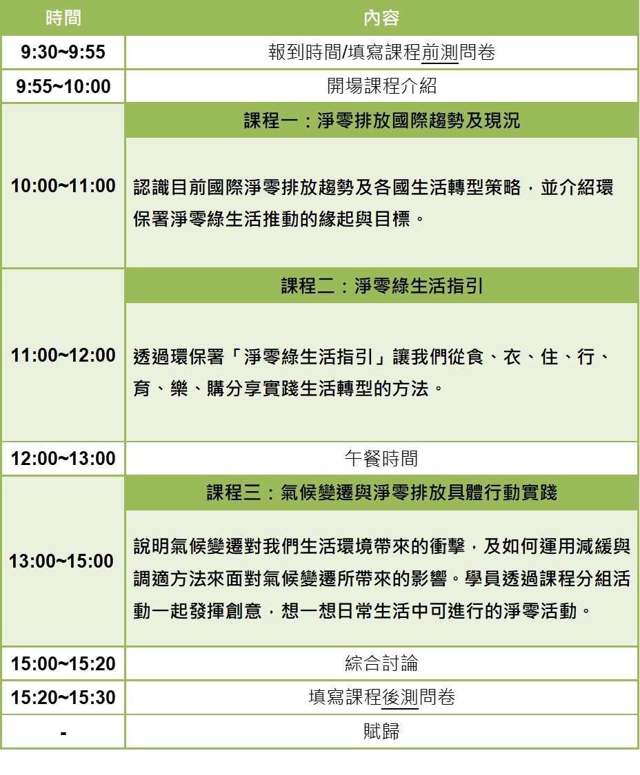 7.【課程費用】:免費參加,每場次皆提供午餐茶水,全程參與學員贈送淨零小物1份喔~!。*為提倡Net Zero淨零目標,活動請自行準備餐具(杯),謝謝!*