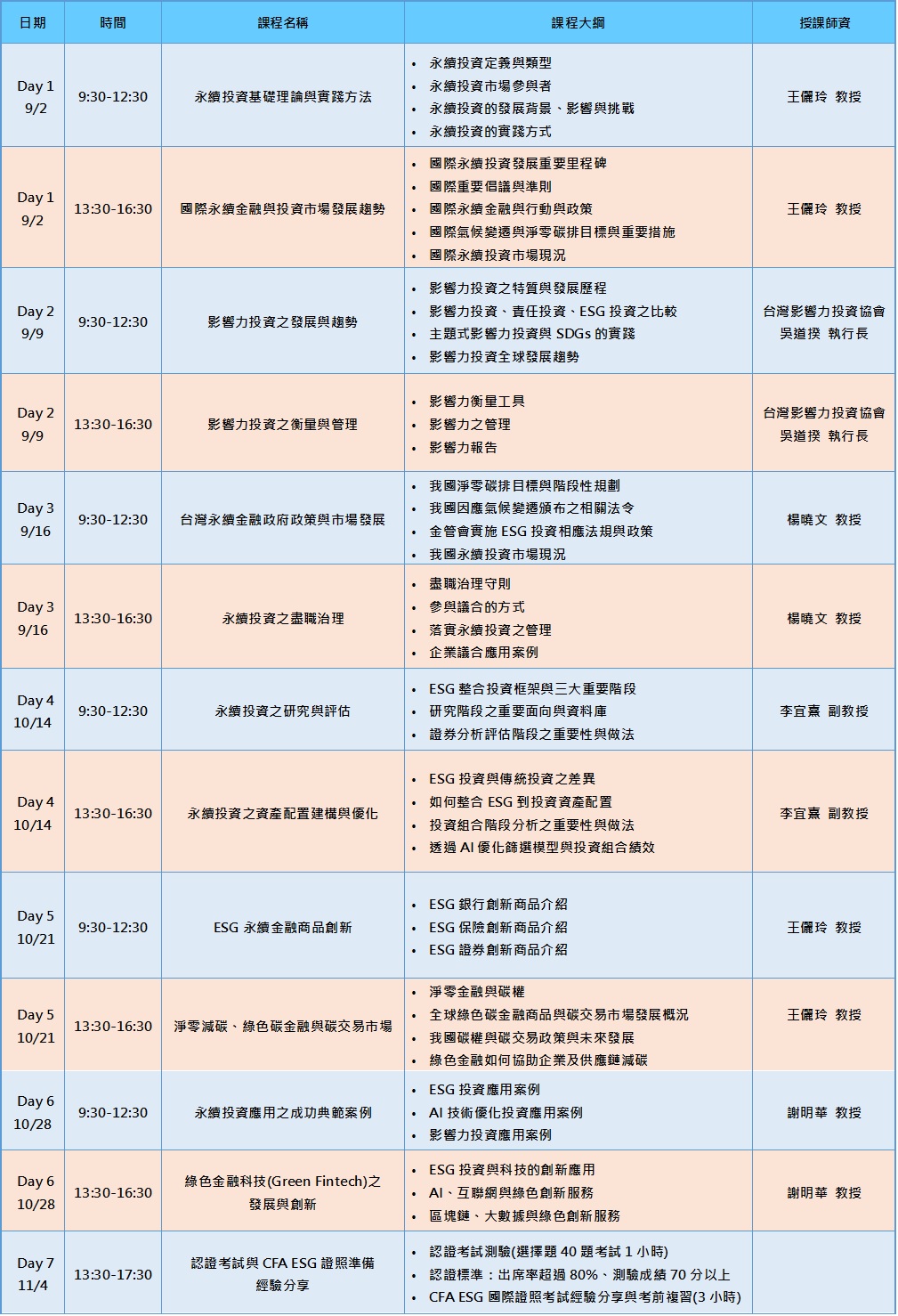 - 本課程以 CFA 的 Certificate in ESG Investing 認證相關教材為基礎,同時彙整全球 ESG 投資與綠色金融市場、影響力投資市場之發展與趨勢,並介紹國際典範機構成功經驗。課程內容兼具理論與實務,除了讓學員完整清楚瞭解專業的 ESG 投資理論基礎,擴展相關知識外,並能瞭解國際最新永續投資與金融創新之脈動趨勢,在ESG 投資領域掌握先機取得優勢。