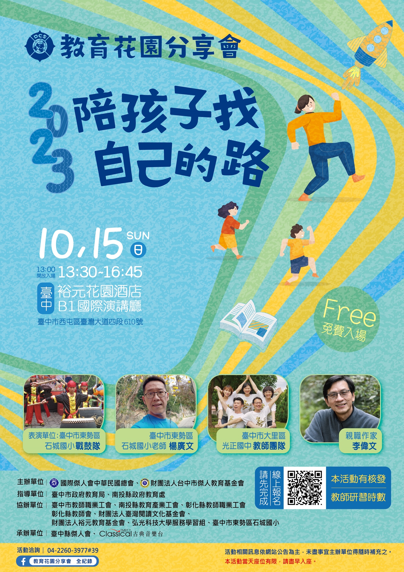 2023教育花園分享會「陪孩子找自己的路」,邀請親職作家-李偉文、熱血特教老師-楊廣文及光啟尬電正學堂教師團隊來分享,還有石城國小足以震撼全場的戰鼓隊開場表演。