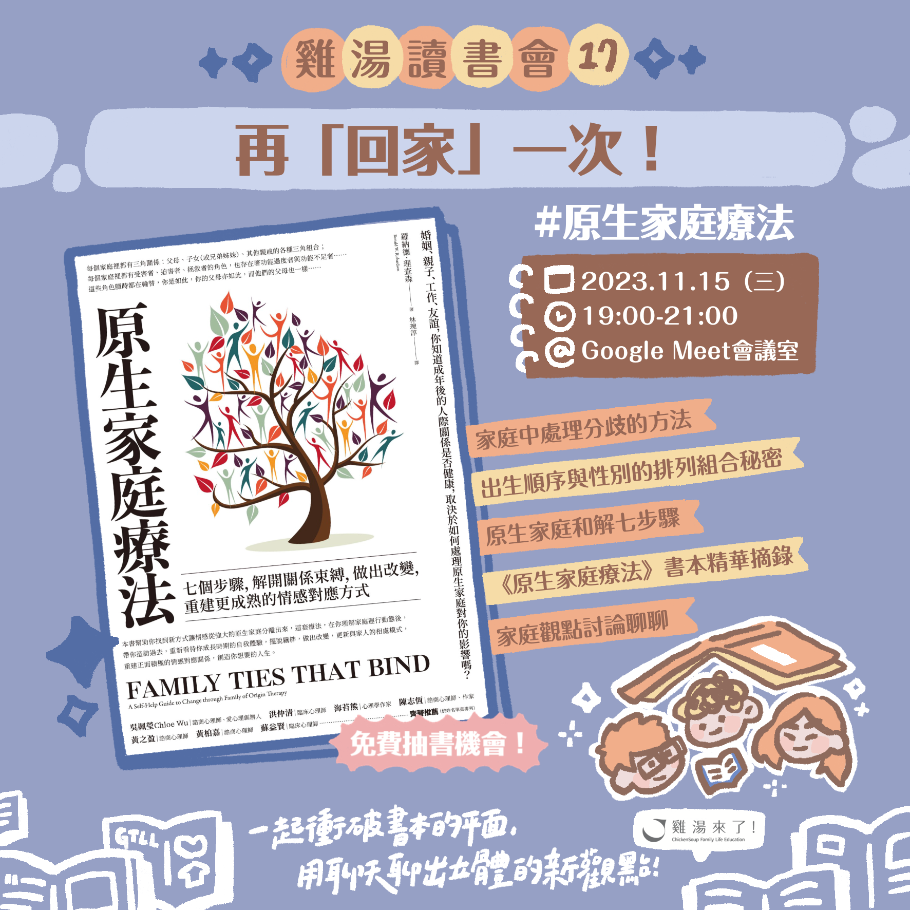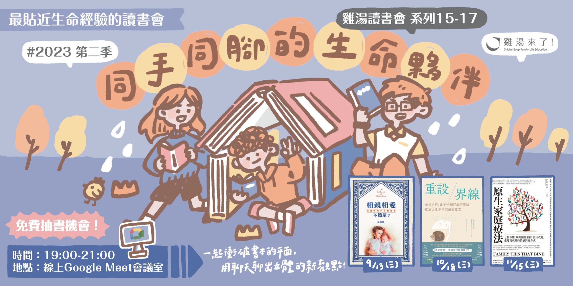 雞湯讀書會家庭系列第15-17場,每月陪你一同選書、摘錄精華與家庭知識,帶你衝破書本的平面,用聊天聊出立體的新觀點。