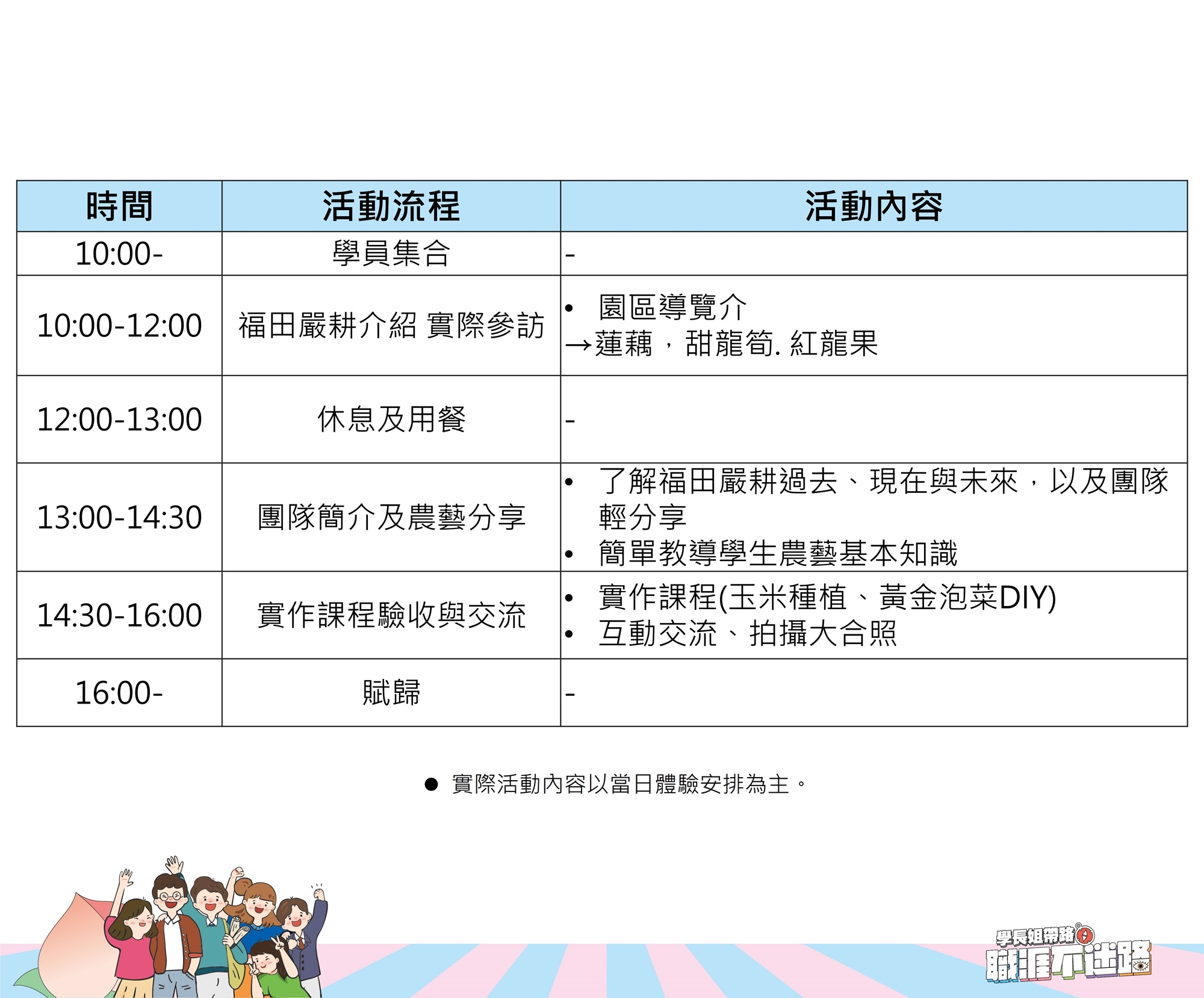 - 活動皆全程免費,並提供餐食、保險及接駁。